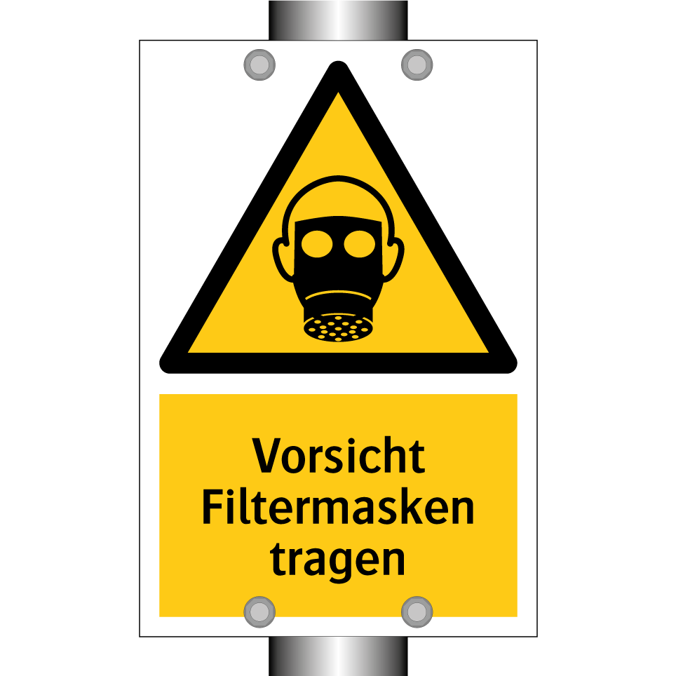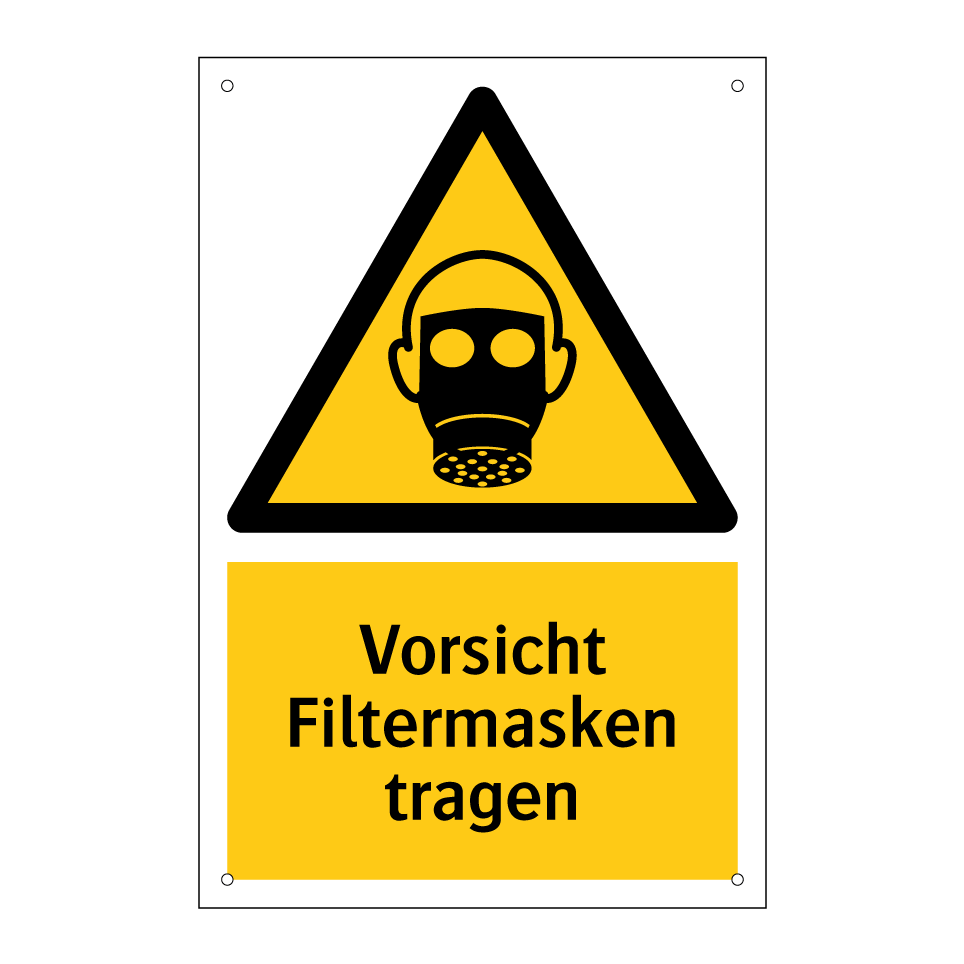 Warnschild mit dem Text Vorsicht Filtermasken tragen