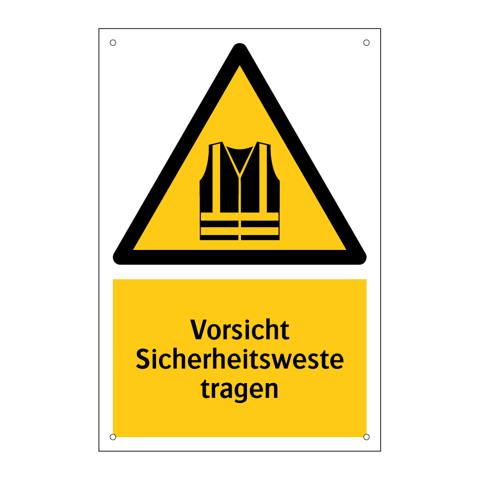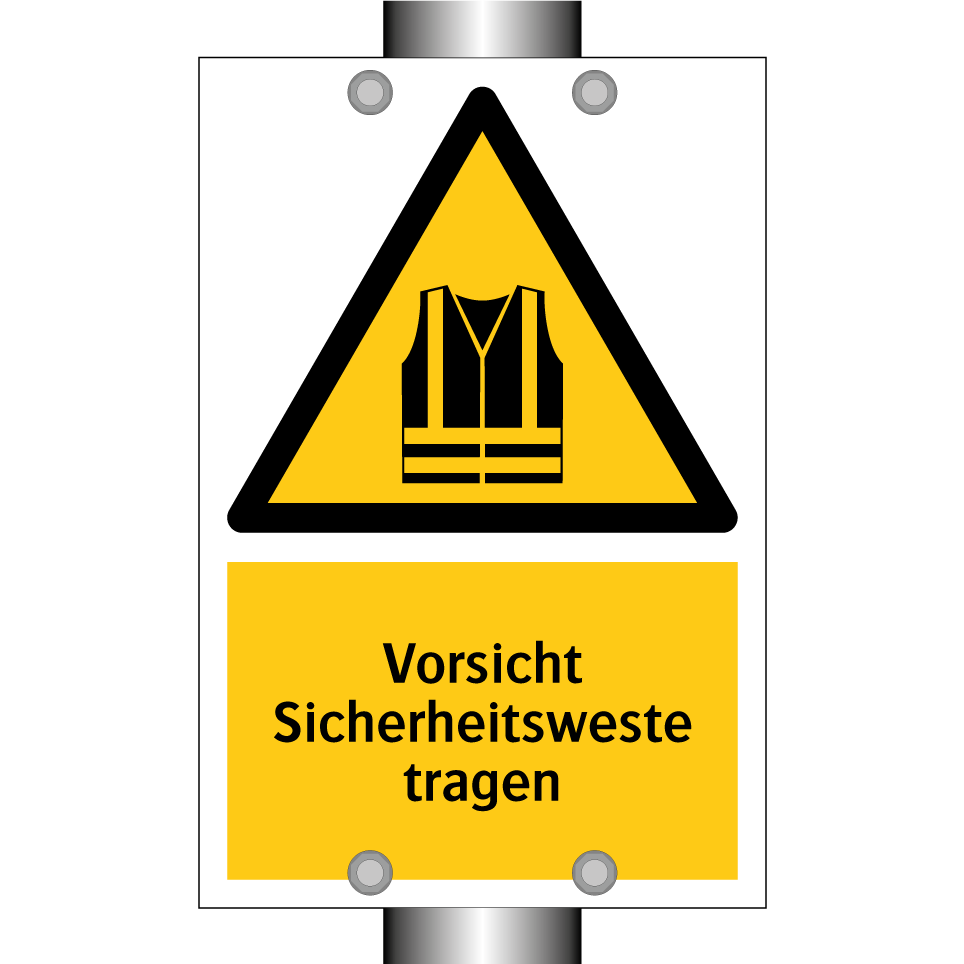 Warnschild mit dem Text Vorsicht Sicherheitsweste tragen