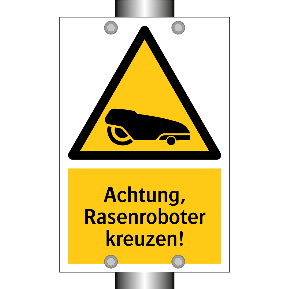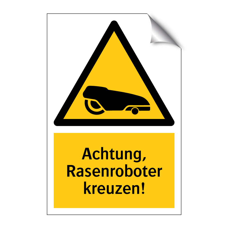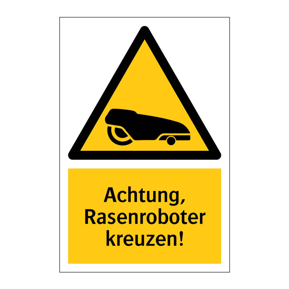 Warnschild mit dem Text Achtung, Rasenroboter kreuzen!