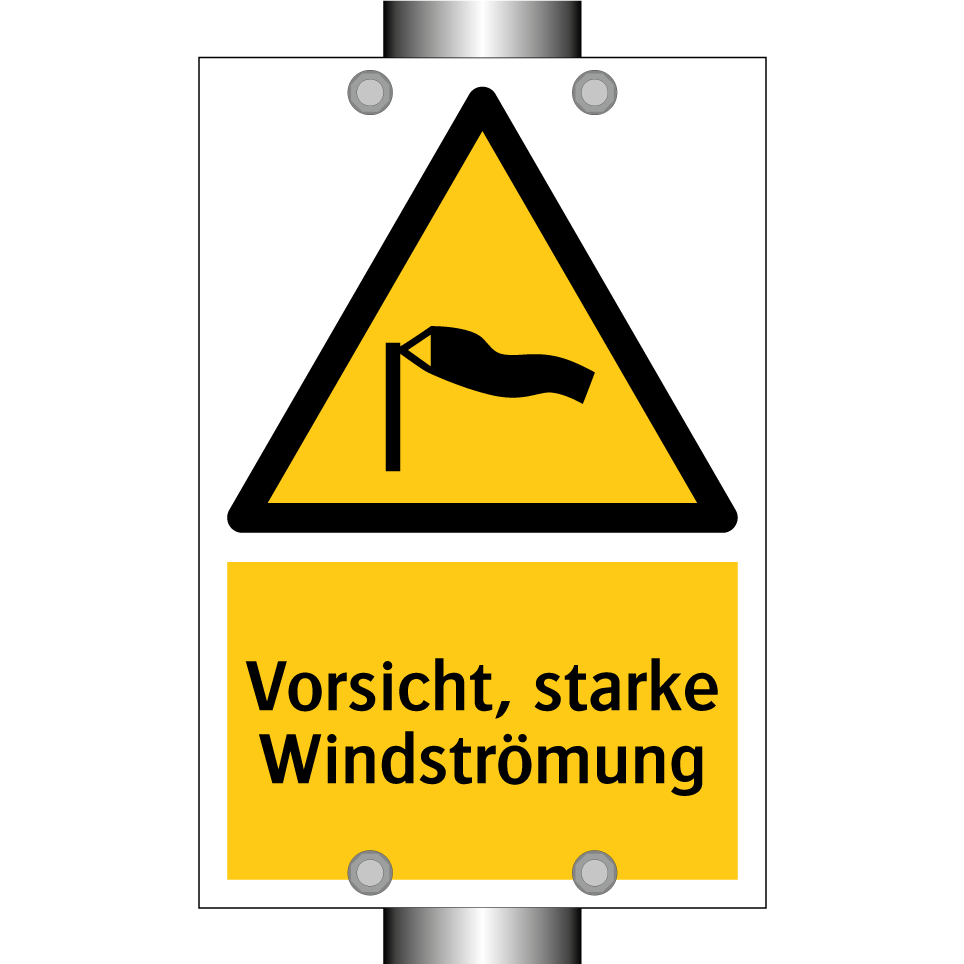 Warnschild mit dem Text Vorsicht, starke Windströmung