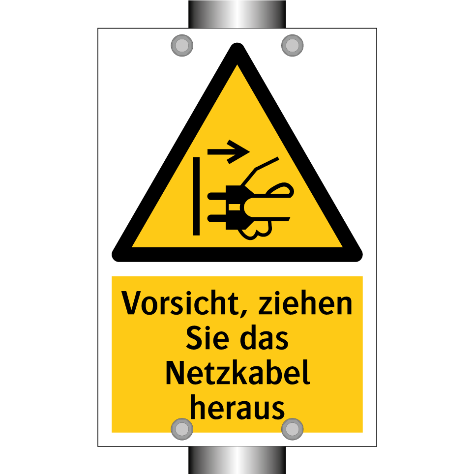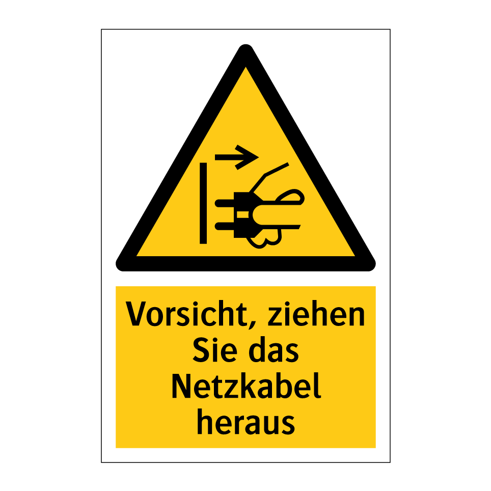 Warnschild mit dem Text Vorsicht, ziehen Sie das Netzkabel heraus