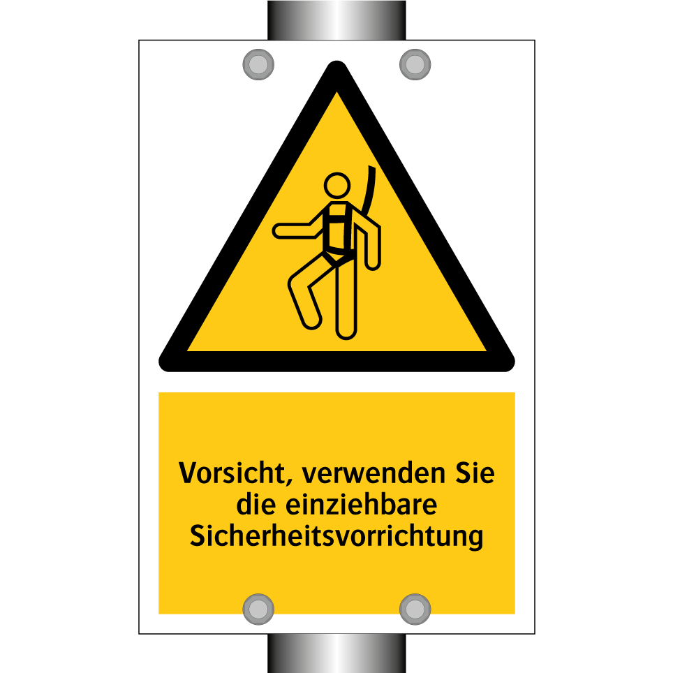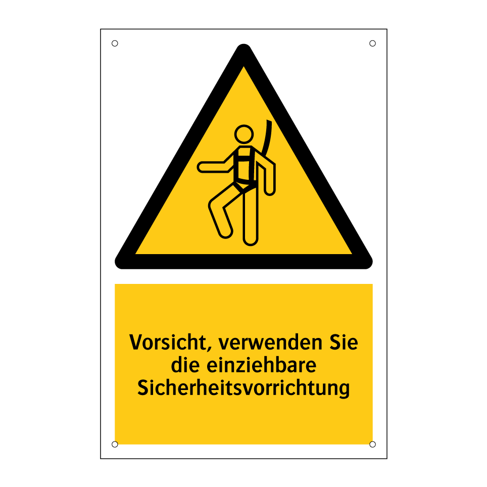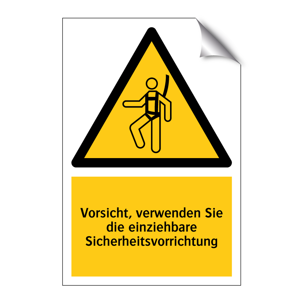 Warnschild mit dem Text Vorsicht, verwenden Sie die einziehbare Sicherheitsvorrichtung