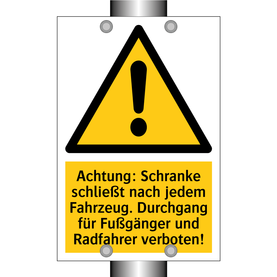 Warnschild mit dem Text Achtung: Schranke schließt nach jedem Fahrzeug. Durchgang für Fußgänger und Radfahrer verboten!