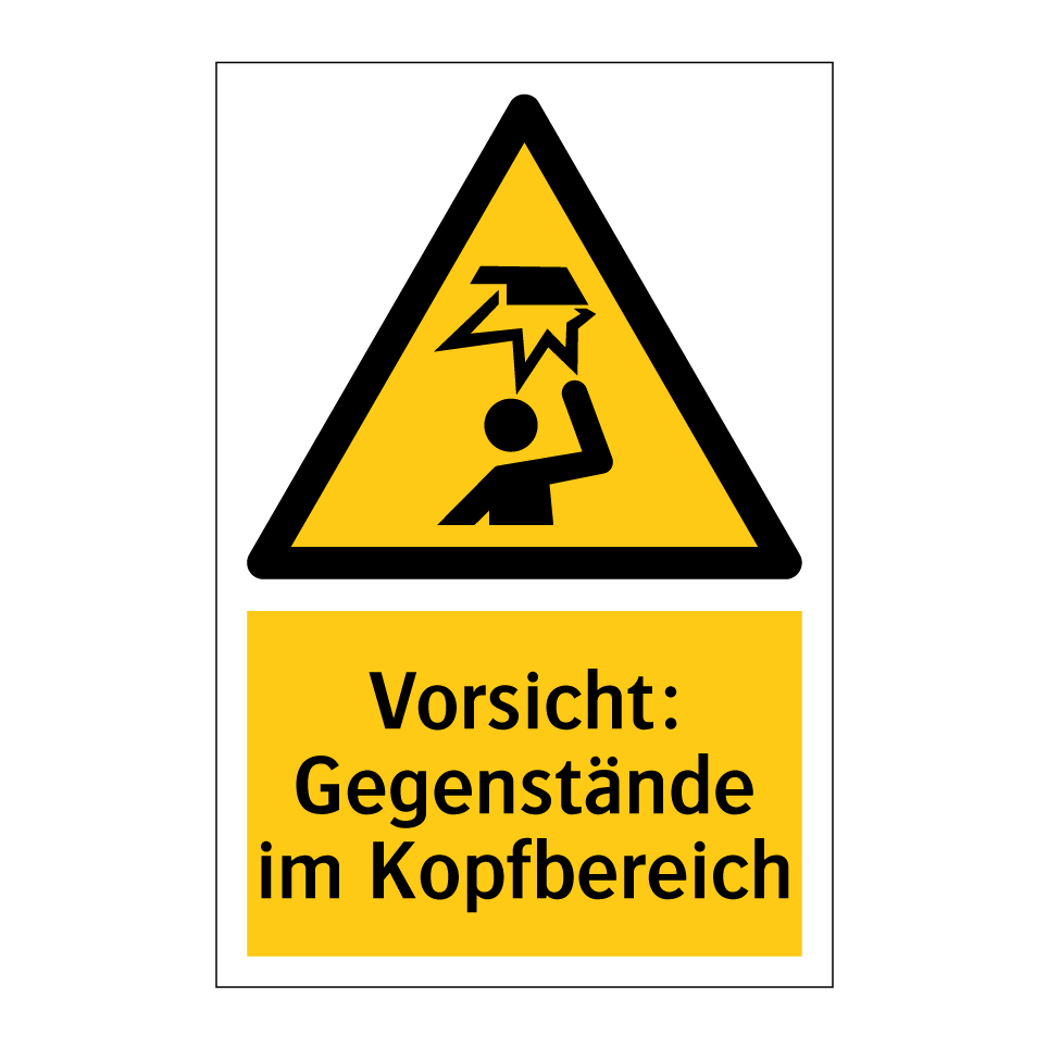 Warnschild mit dem Text Vorsicht: Gegenstände im Kopfbereich