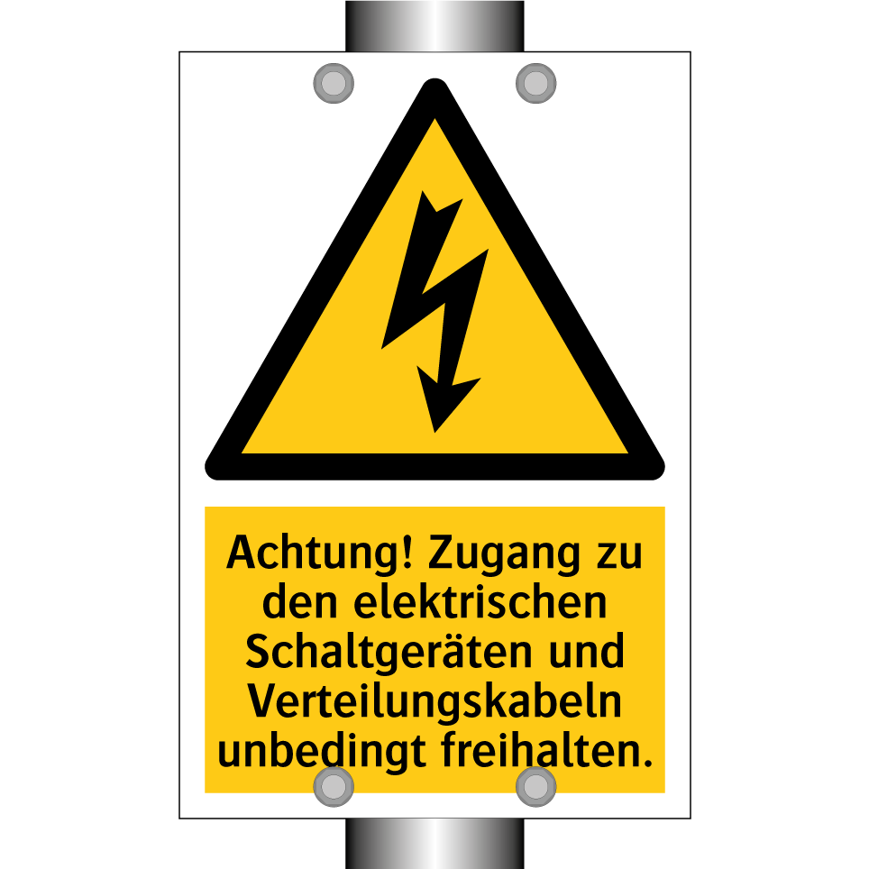 Warnschild mit dem Text Achtung! Zugang zu den elektrischen Schaltgeräten und Verteilungskabeln unbedingt freihalten.