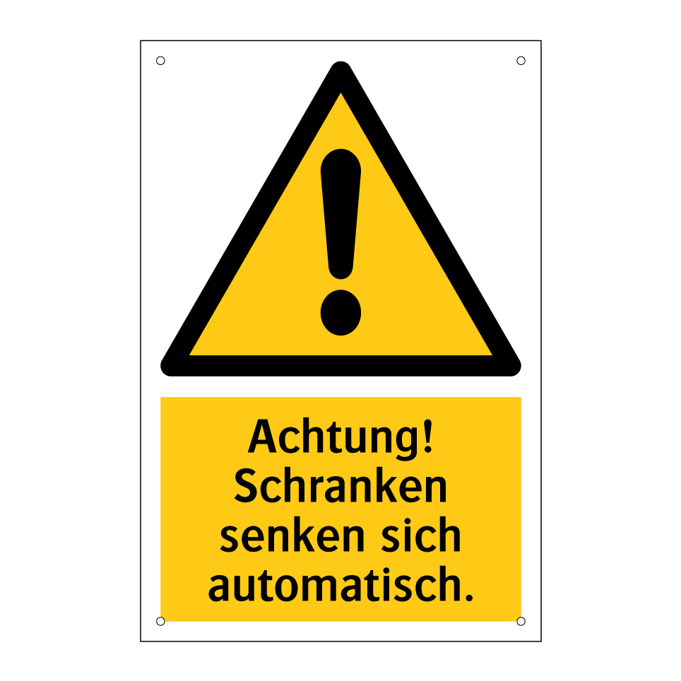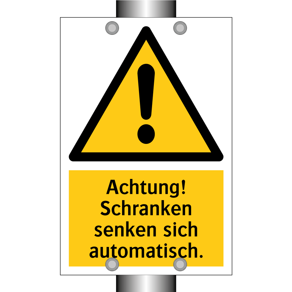 Warnschild mit dem Text Achtung! Schranken senken sich automatisch.