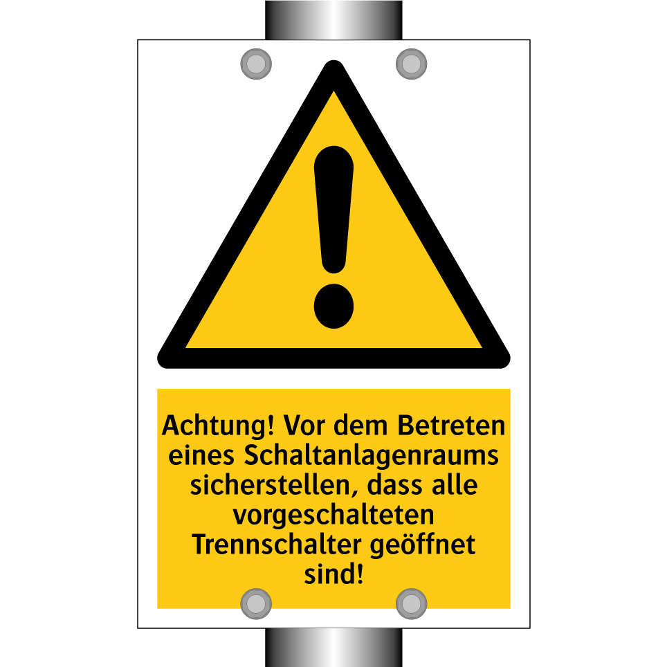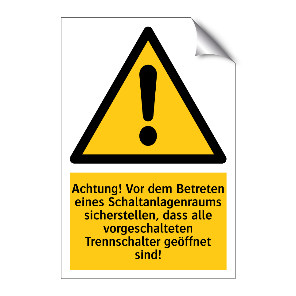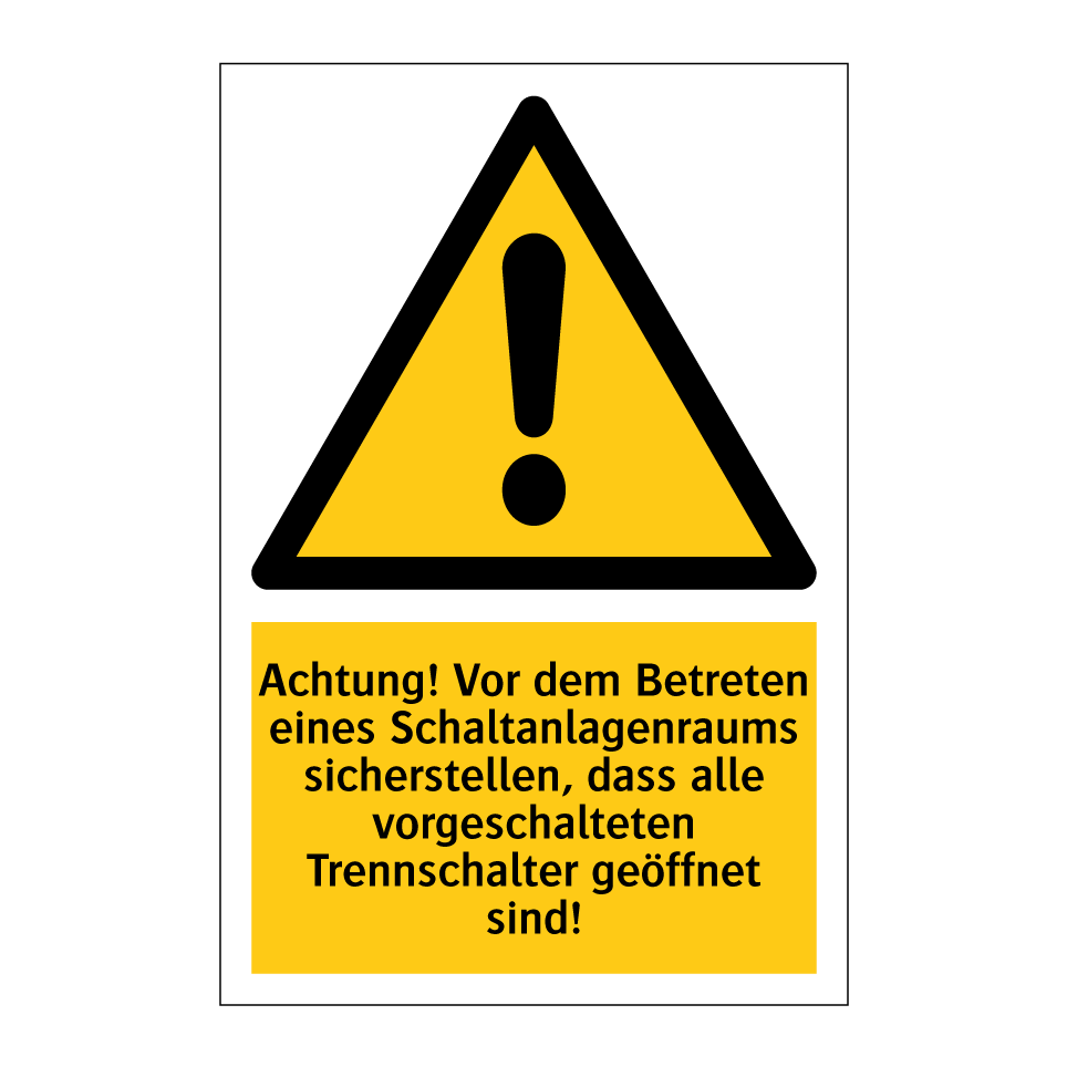 Warnschild mit dem Text Achtung! Vor dem Betreten eines Schaltanlagenraums sicherstellen, dass alle vorgeschalteten Trennschalter geöffnet sind!