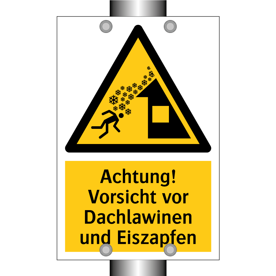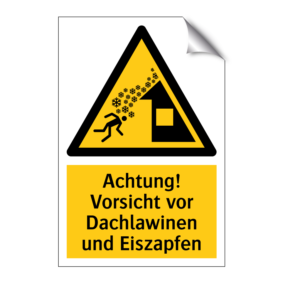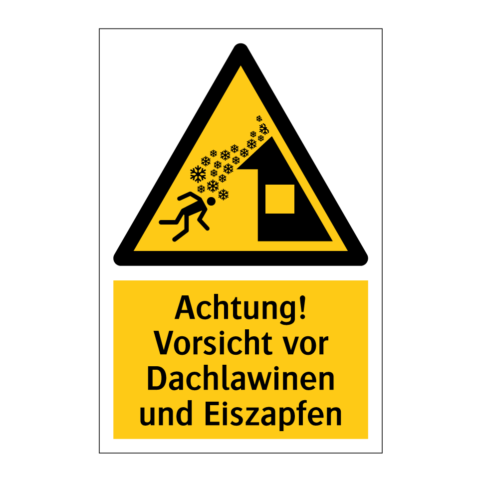 Warnschild mit dem Text Achtung! Vorsicht vor Dachlawinen und Eiszapfen