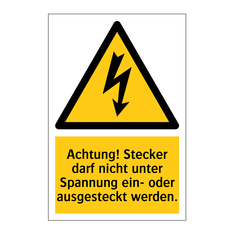 Warnschild mit dem Text Achtung! Stecker darf nicht unter Spannung ein- oder ausgesteckt werden.