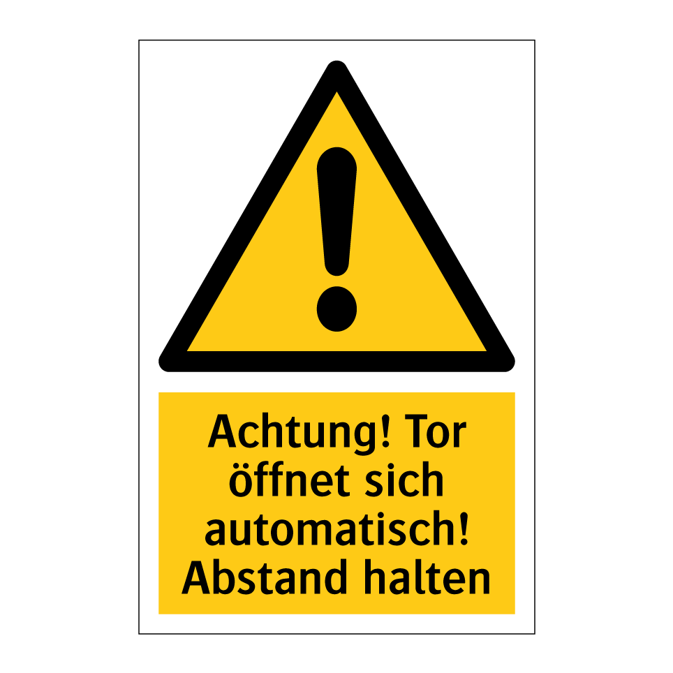 Warnschild mit dem Text Achtung! Tor öffnet sich automatisch! Abstand halten
