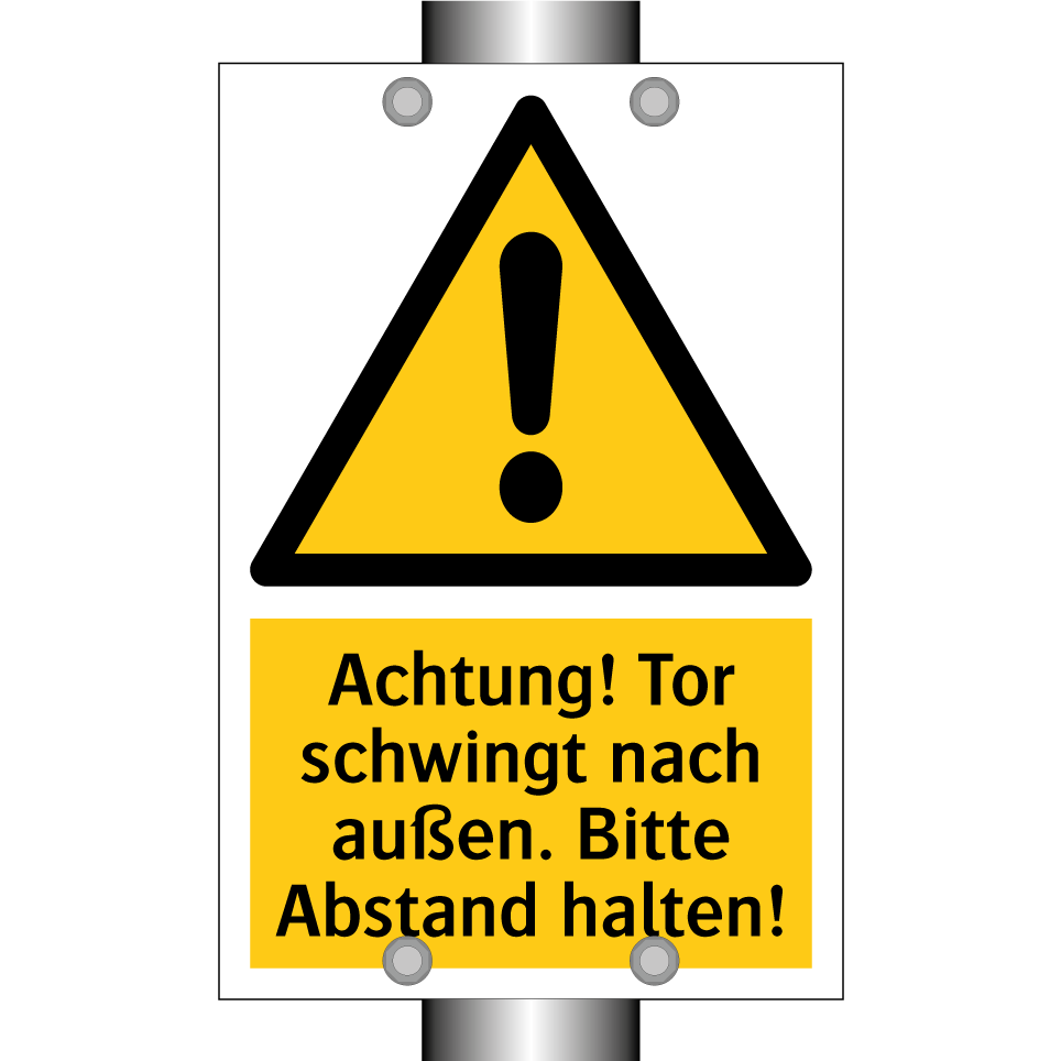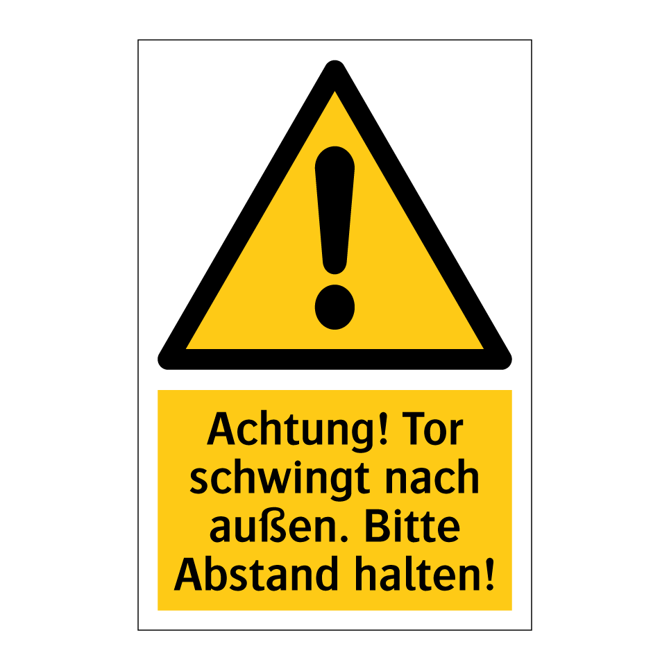 Warnschild mit dem Text Achtung! Tor schwingt nach außen. Bitte Abstand halten!