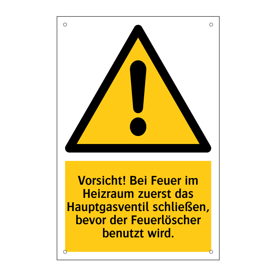 Warnschild mit dem Text Vorsicht! Bei Feuer im Heizraum zuerst das Hauptgasventil schließen, bevor der Feuerlöscher benutzt wird.