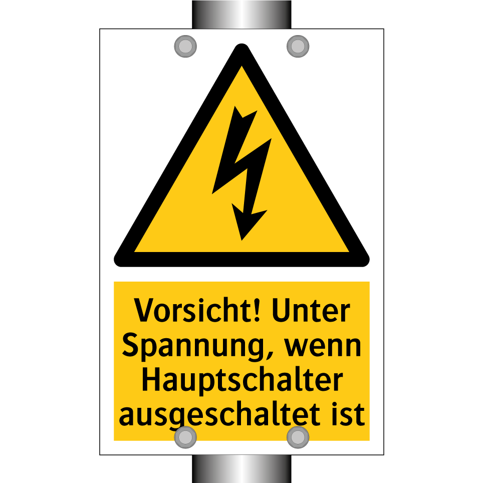 Warnschild mit dem Text Vorsicht! Unter Spannung, wenn Hauptschalter ausgeschaltet ist