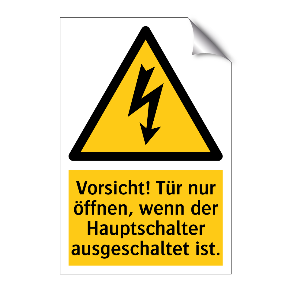 Warnschild mit dem Text Vorsicht! Tür nur öffnen, wenn der Hauptschalter ausgeschaltet ist.