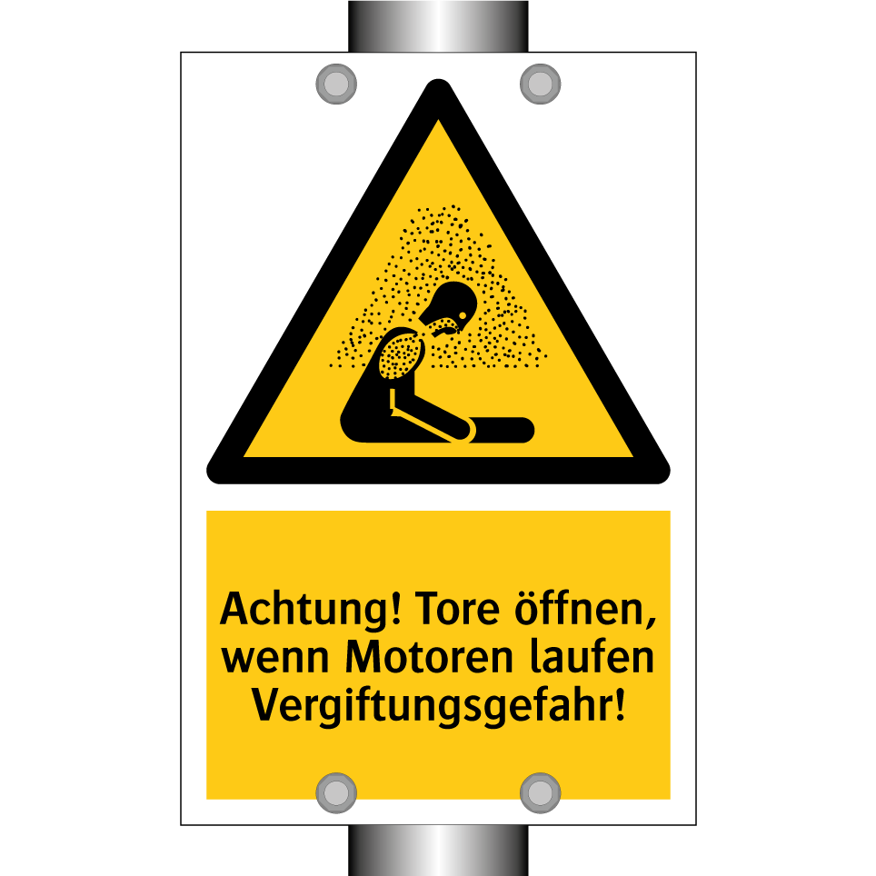 Warnschild mit dem Text Achtung! Tore öffnen, wenn Motoren laufen Vergiftungsgefahr!