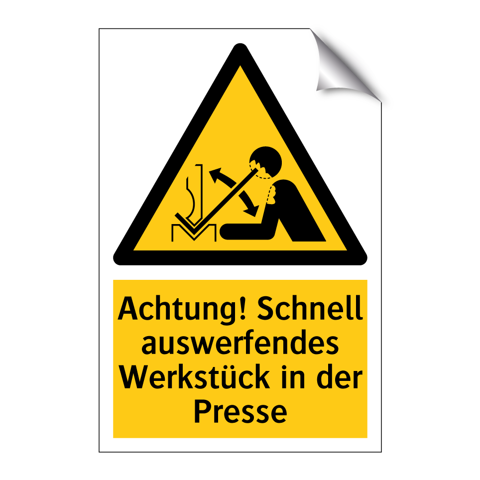 Warnschild mit dem Text Achtung! Schnell auswerfendes Werkstück in der Presse