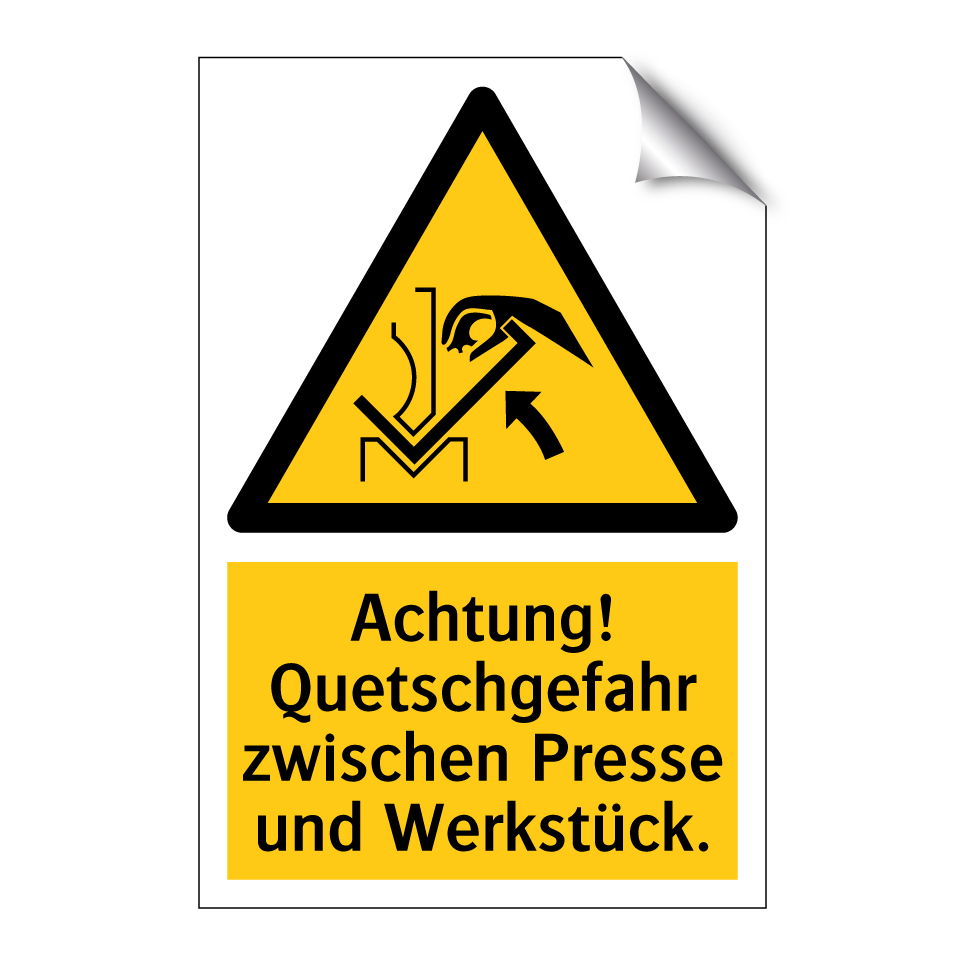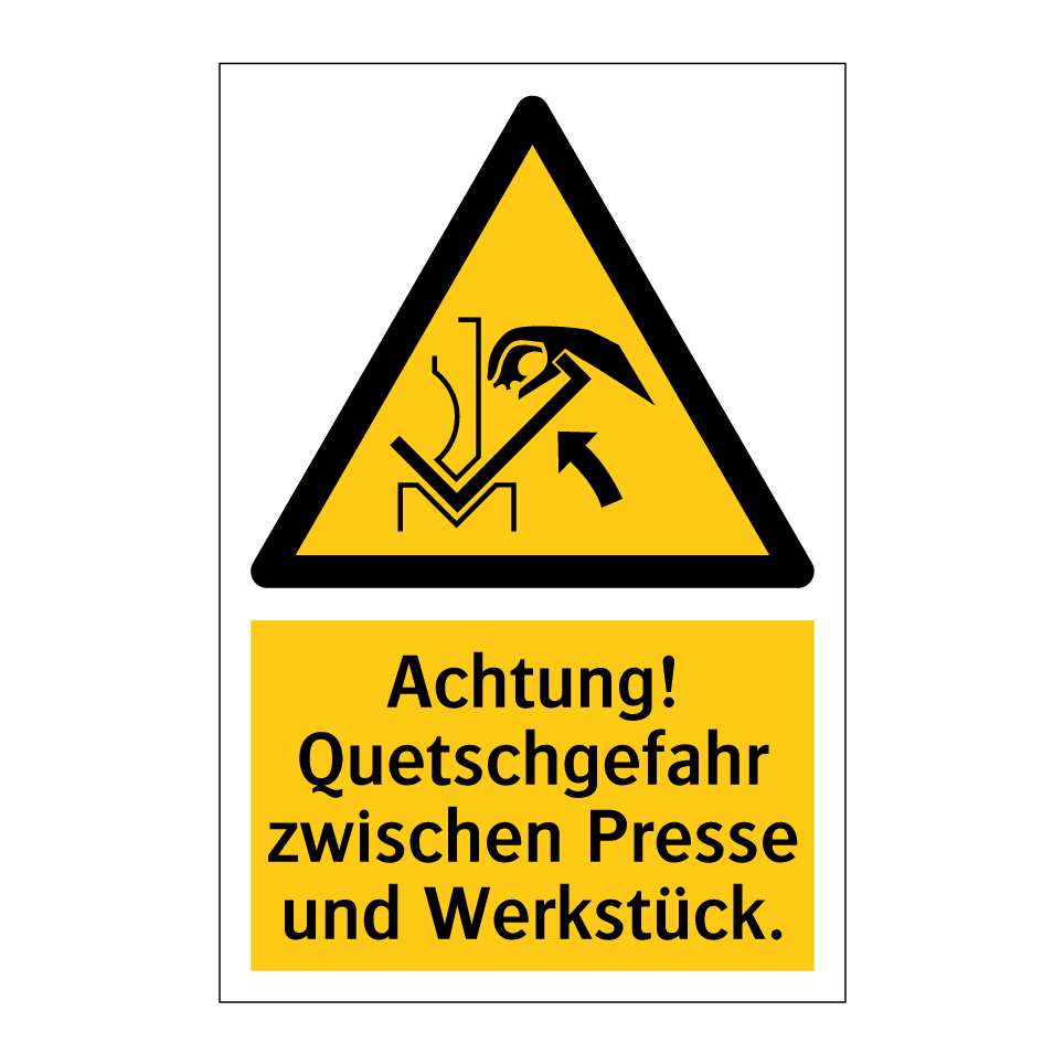 Warnschild mit dem Text Achtung! Quetschgefahr zwischen Presse und Werkstück.