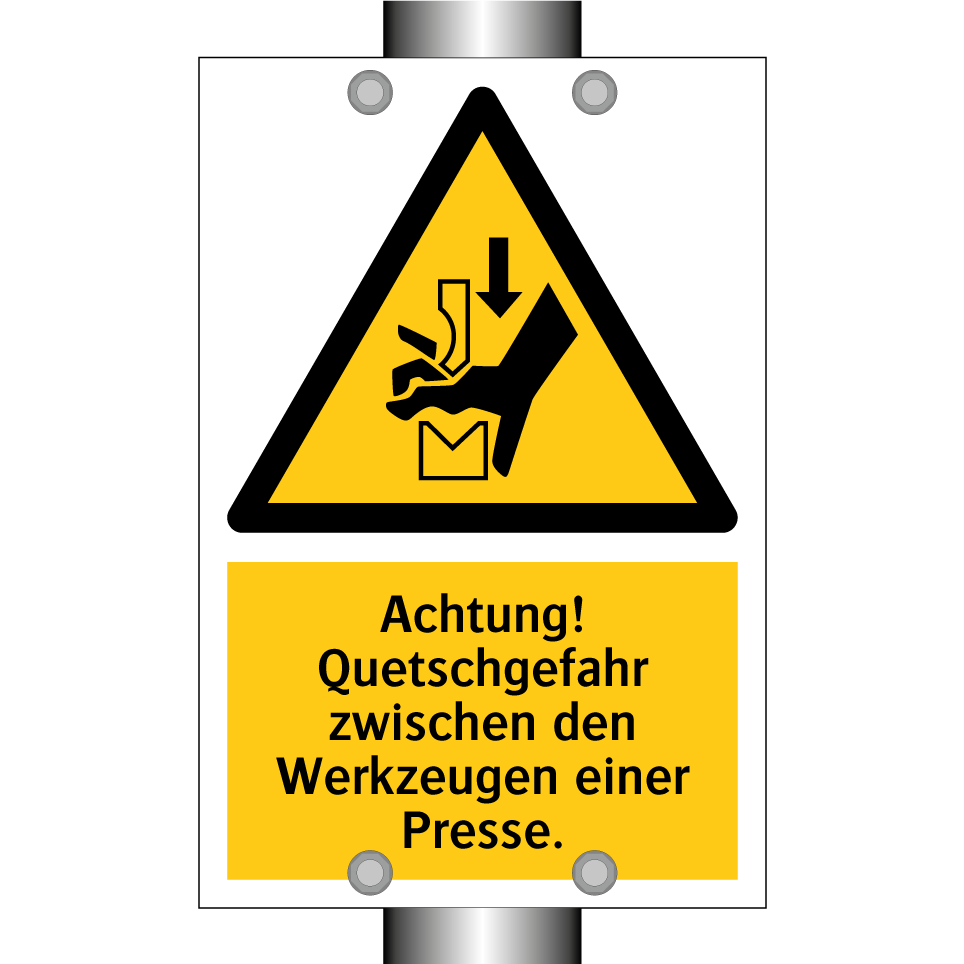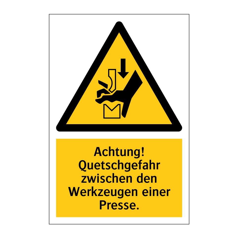Warnschild mit dem Text Achtung! Quetschgefahr zwischen den Werkzeugen einer Presse.