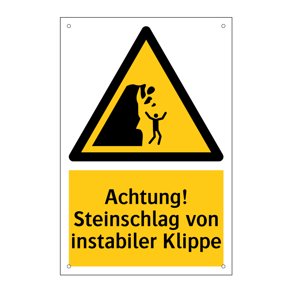 Diese auffällige Warnschild mit gelbem Hintergrund und schwarzer Schrift ist ideal, um auf die Gefahr von herabfallenden Steinen an instabilen Klippen hinzuweisen. Sie eignet sich hervorragend für den Einsatz in Gebieten mit erhöhtem Risiko für Steinschlag, wie zum Beispiel an Wanderwegen, in der Nähe von Felsformationen oder an Küstenklippen. Durch die klare Symbolik und die prägnante Botschaft wird die Aufmerksamkeit der Passanten effektiv auf potenzielle Gefahren gelenkt. Diese Warnschilder sind unverzichtbar für die Sicherheit in gefährdeten Gebieten und tragen dazu bei, Unfälle zu vermeiden, indem sie rechtzeitig auf mögliche Gefahrenquellen hinweisen.