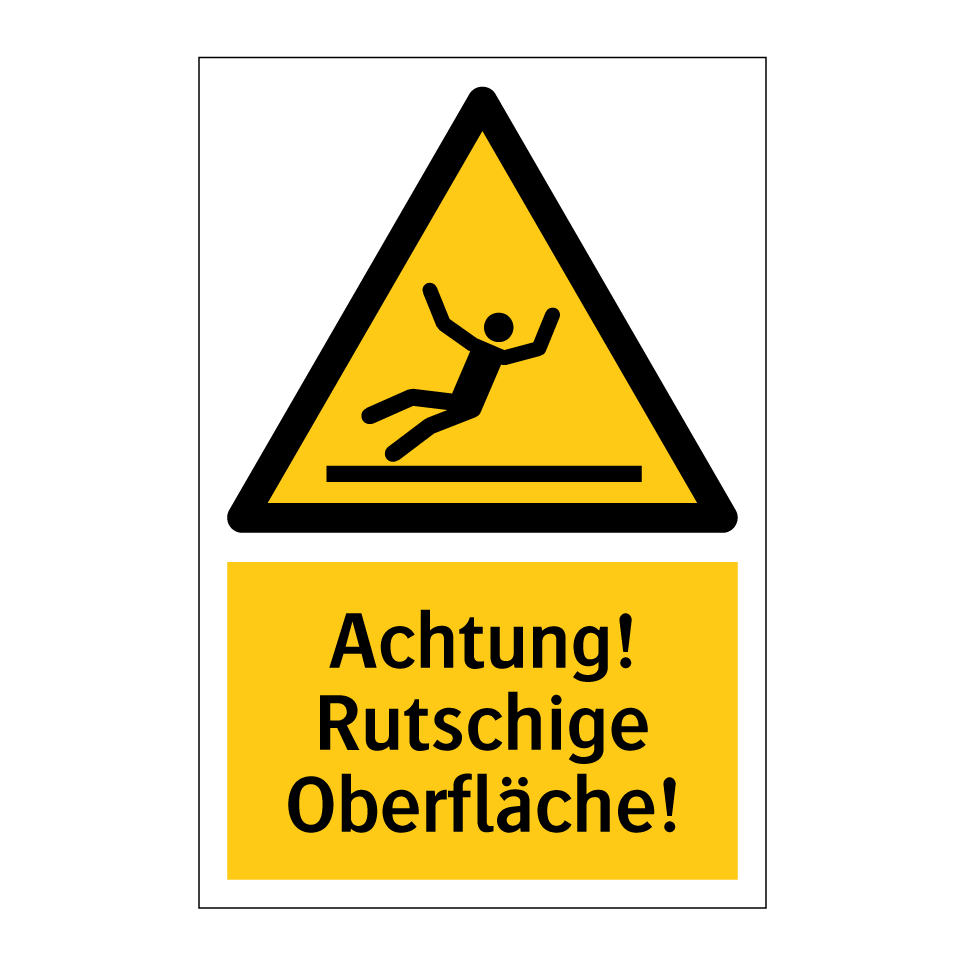 Diese auffällige Warnschild mit gelbem Hintergrund und schwarzer Schrift ist ideal, um auf rutschige Oberflächen hinzuweisen. Sie eignet sich perfekt für den Einsatz in Bereichen, in denen erhöhte Vorsicht geboten ist, wie zum Beispiel in Eingangsbereichen, auf Treppen oder in Produktionshallen. Die klare Symbolik und die prägnante Botschaft sorgen dafür, dass die Warnung nicht übersehen wird. Ob in öffentlichen Gebäuden, Büros oder Lagerhäusern – diese Warnschilder sind unverzichtbar, um Unfälle zu vermeiden und die Sicherheit zu gewährleisten. Platzieren Sie die Warnung an gut sichtbaren Stellen, um maximale Aufmerksamkeit zu erzielen.