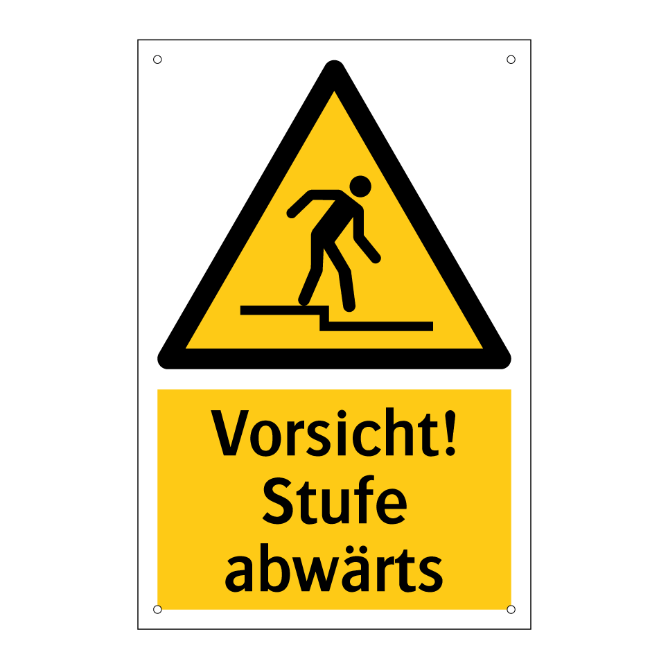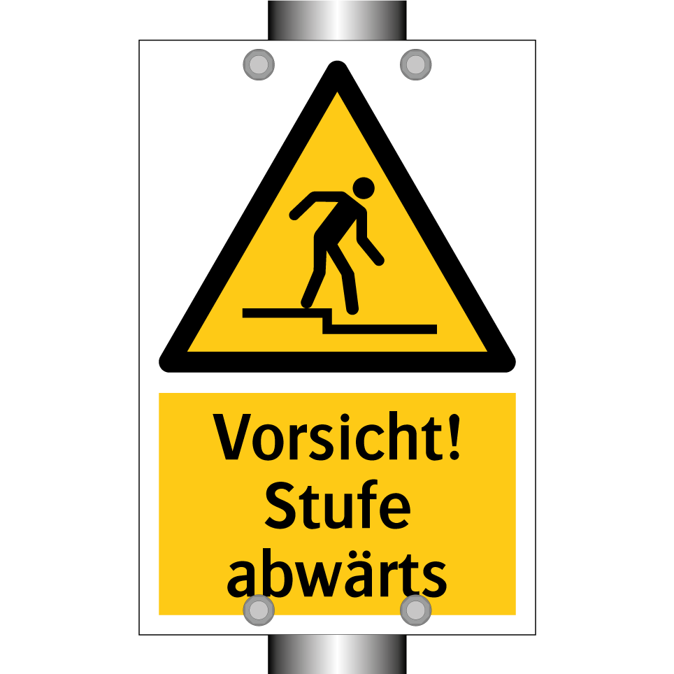 Warnschild mit dem Text Vorsicht! Stufe abwärts