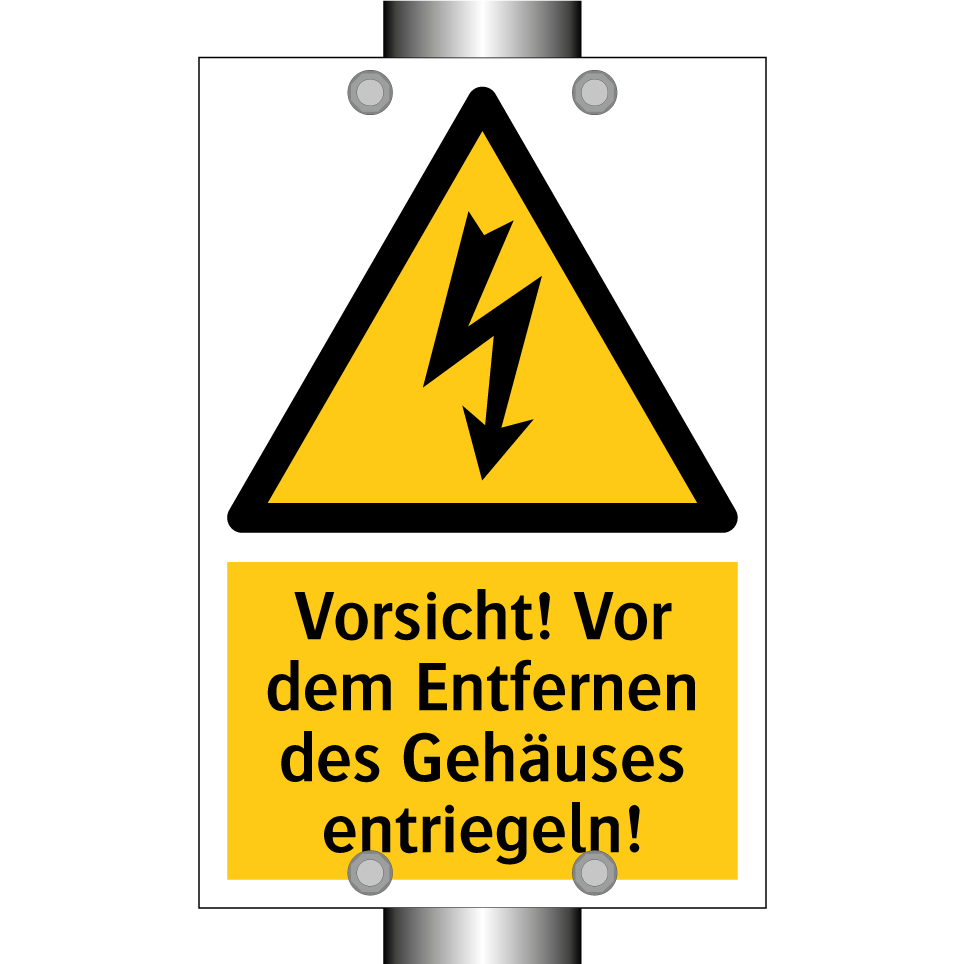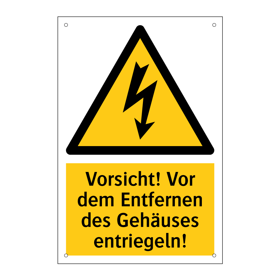 Warnschild mit dem Text Vorsicht! Vor dem Entfernen des Gehäuses entriegeln!