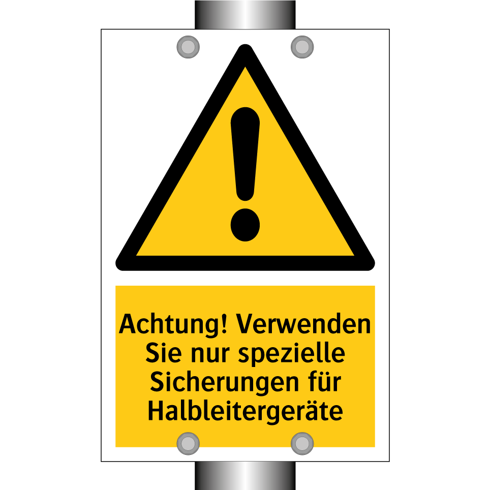 Warnschild mit dem Text Achtung! Verwenden Sie nur spezielle Sicherungen für Halbleitergeräte