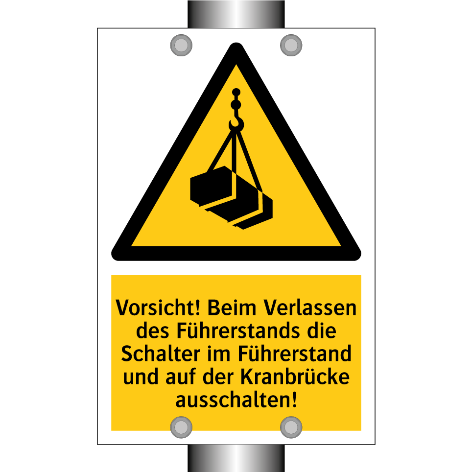 Warnschild mit dem Text Vorsicht! Beim Verlassen des Führerstands die Schalter im Führerstand und auf der Kranbrücke ausschalten!