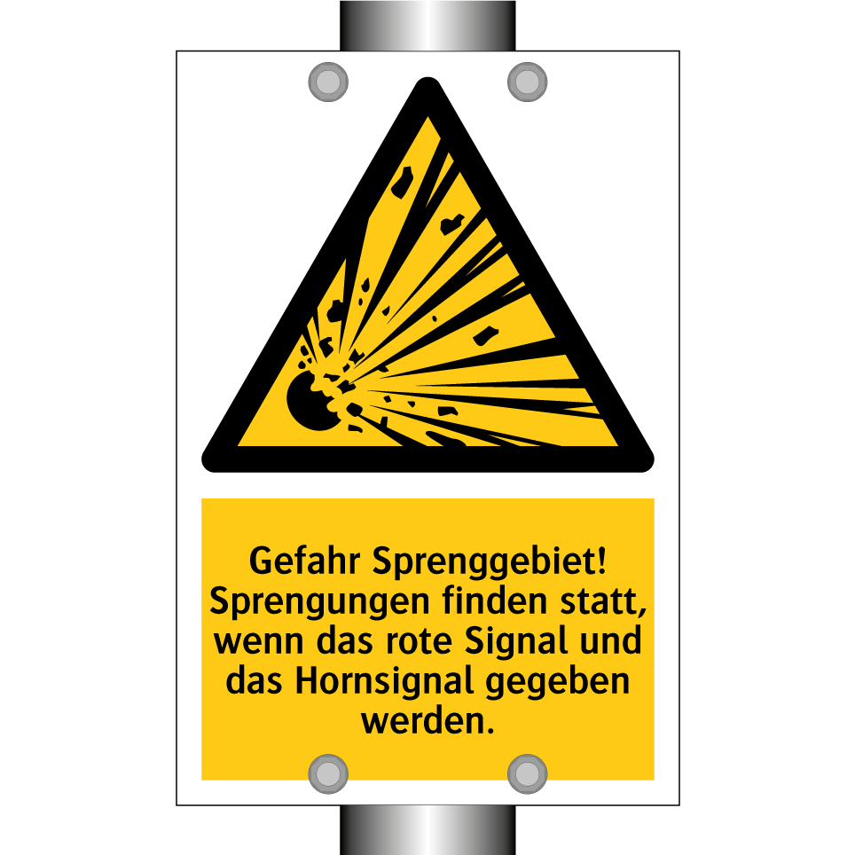 Warnschild mit dem Text Gefahr Sprenggebiet! Sprengungen finden statt, wenn das rote Signal und das Hornsignal gegeben werden.