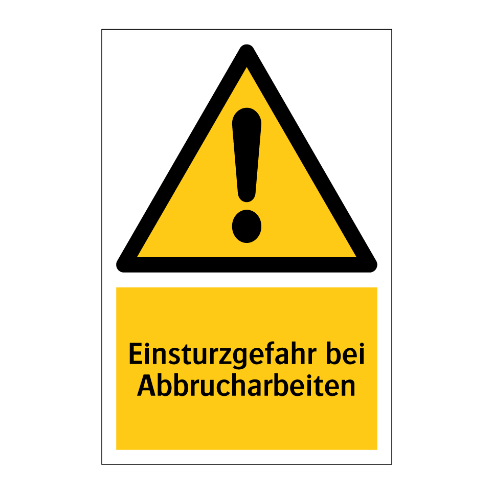Diese auffällige Warnschild mit gelbem Hintergrund und schwarzer Schrift ist ideal, um auf die Gefahr von Einstürzen bei Abbrucharbeiten hinzuweisen. Die klare Symbolik sorgt dafür, dass die Botschaft unmissverständlich ist und sofort ins Auge fällt. Diese Warnschilder sind besonders geeignet für Baustellen, Abbruchgebiete und andere gefährliche Arbeitsumgebungen, wo Sicherheitsvorkehrungen oberste Priorität haben. Platzieren Sie das Schild an gut sichtbaren Stellen, um Arbeiter und Besucher effektiv zu warnen und Unfälle zu vermeiden. Durch die strategische Platzierung dieser Warnung wird die Sicherheit auf Ihrer Baustelle erheblich verbessert.