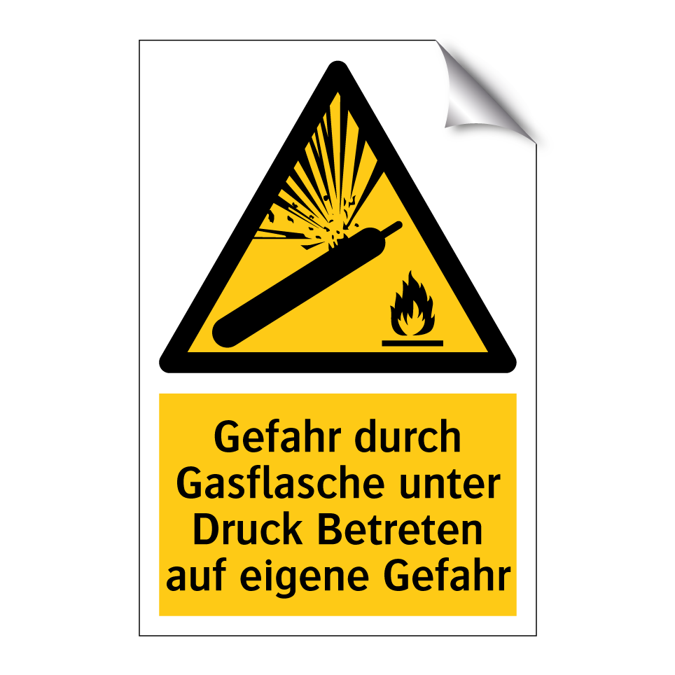 Warnschild mit dem Text Gefahr durch Gasflasche unter Druck Betreten auf eigene Gefahr