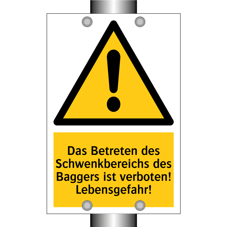 Warnschild mit dem Text Das Betreten des Schwenkbereichs des Baggers ist verboten! Lebensgefahr!