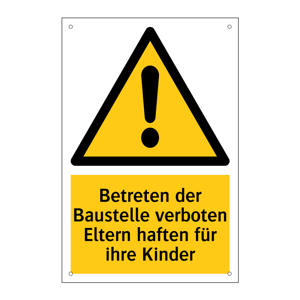 Warnschild mit dem Text Betreten der Baustelle verboten Eltern haften für ihre Kinder