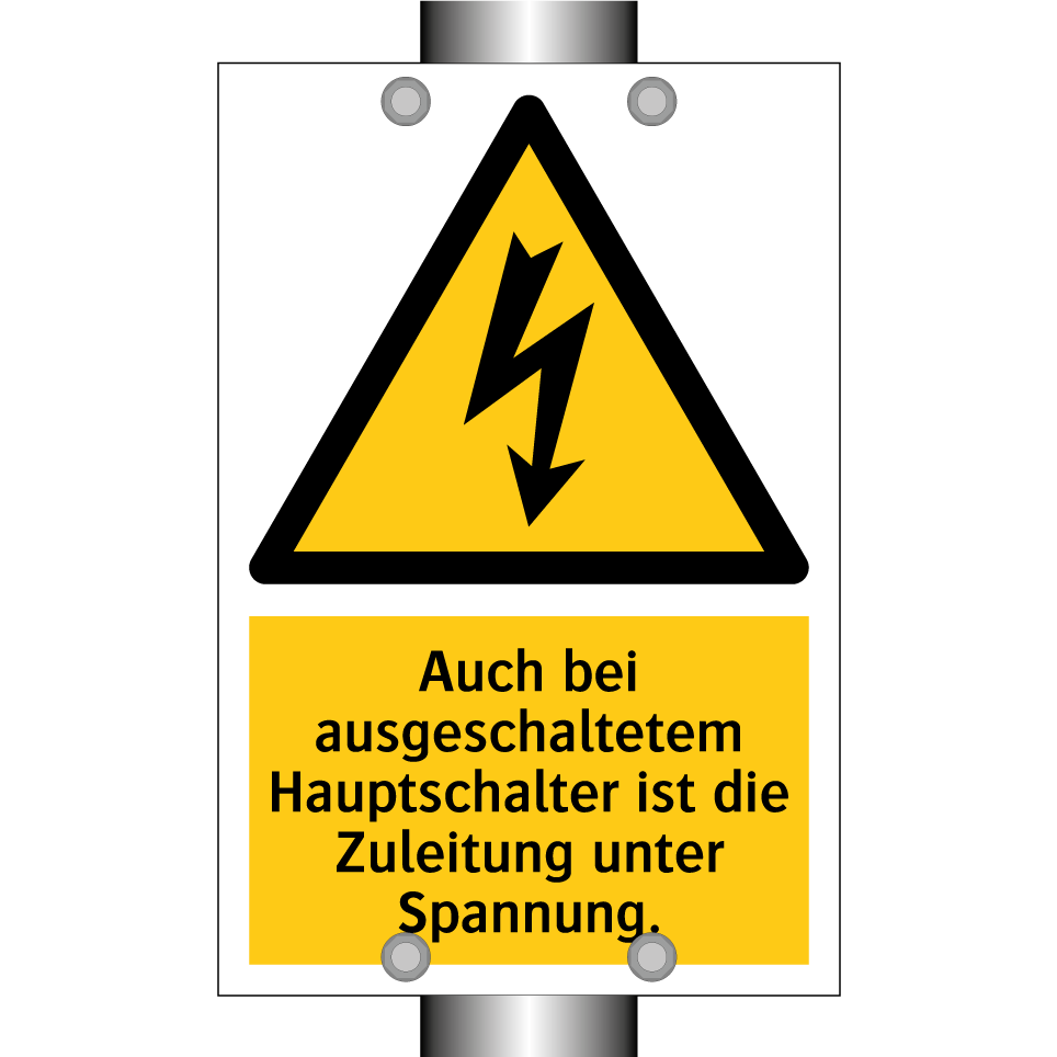 Warnschild mit dem Text Auch bei ausgeschaltetem Hauptschalter ist die Zuleitung unter Spannung.