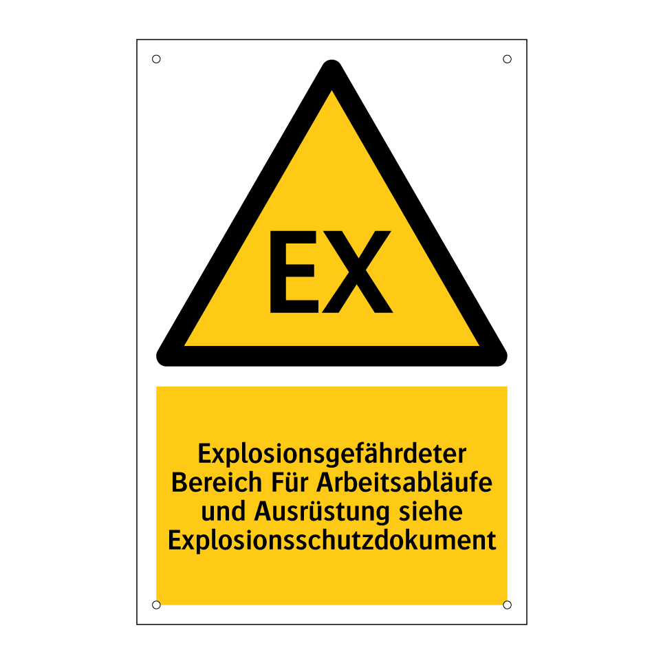 Warnschild mit dem Text Explosionsgefährdeter Bereich Für Arbeitsabläufe und Ausrüstung siehe Explosionsschutzdokument