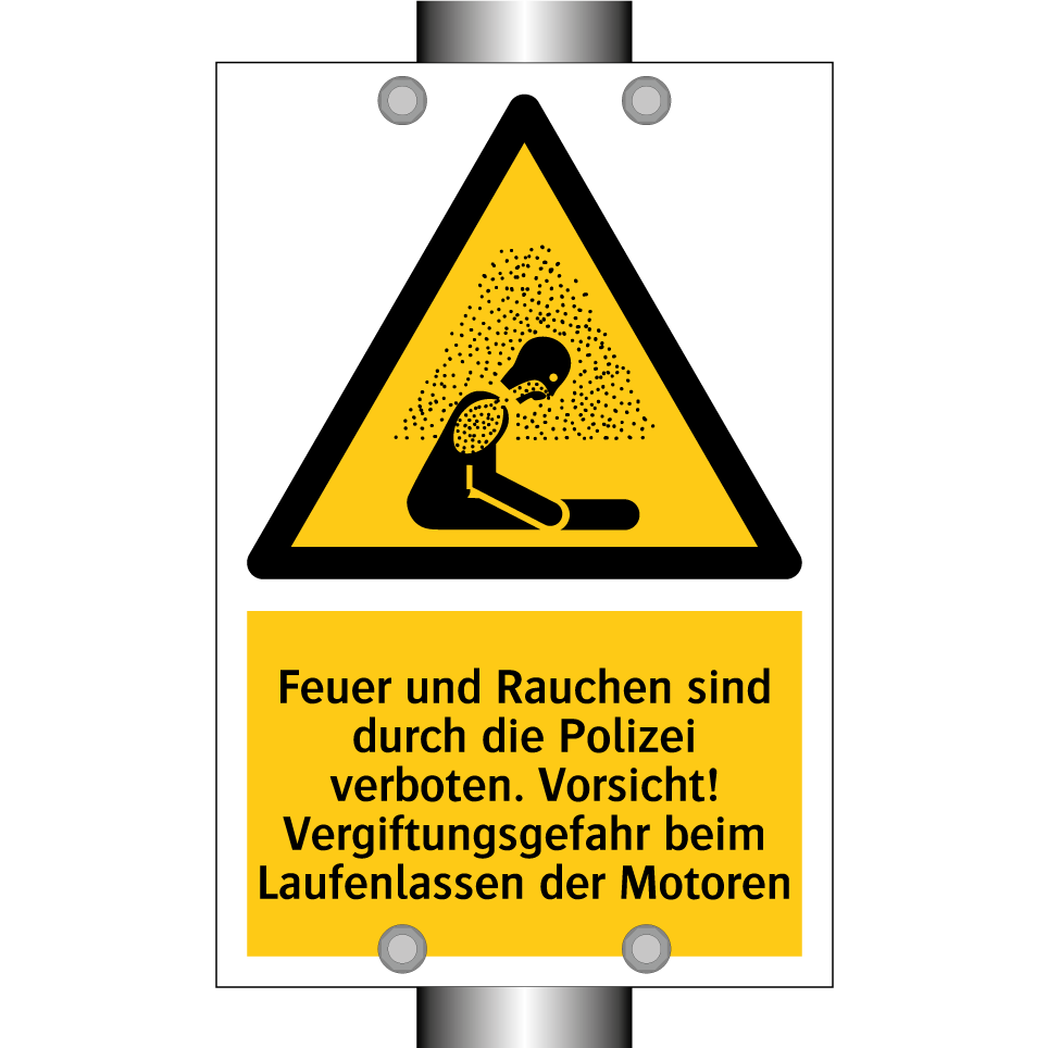 Warnschild mit dem Text Feuer und Rauchen sind durch die Polizei verboten. Vorsicht! Vergiftungsgefahr beim Laufenlassen der Motoren