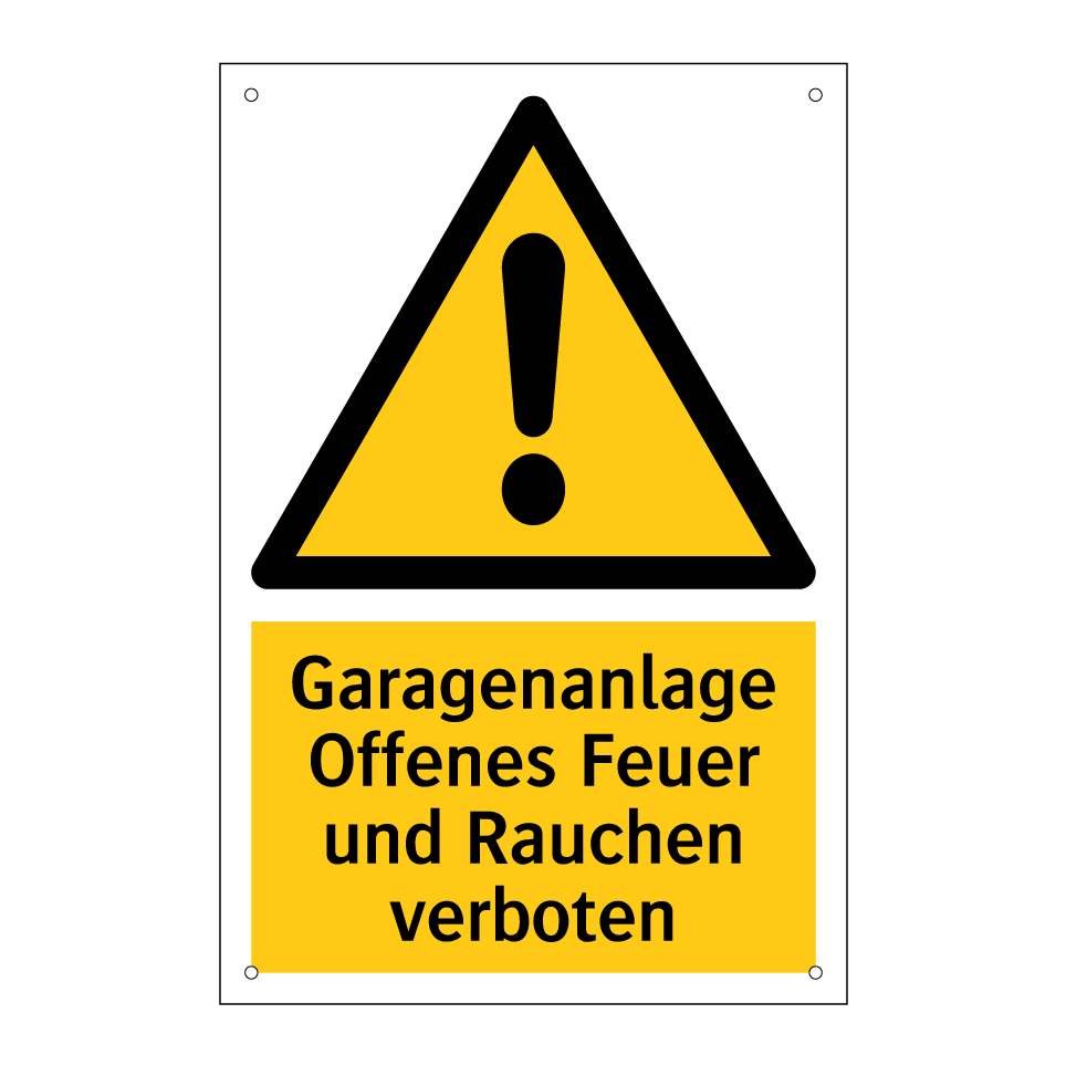 Warnschild mit dem Text Garagenanlage Offenes Feuer und Rauchen verboten