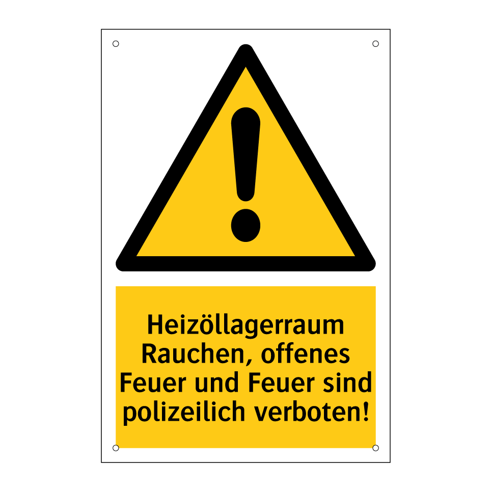 Warnschild mit dem Text Heizöllagerraum Rauchen, offenes Feuer und Feuer sind polizeilich verboten!