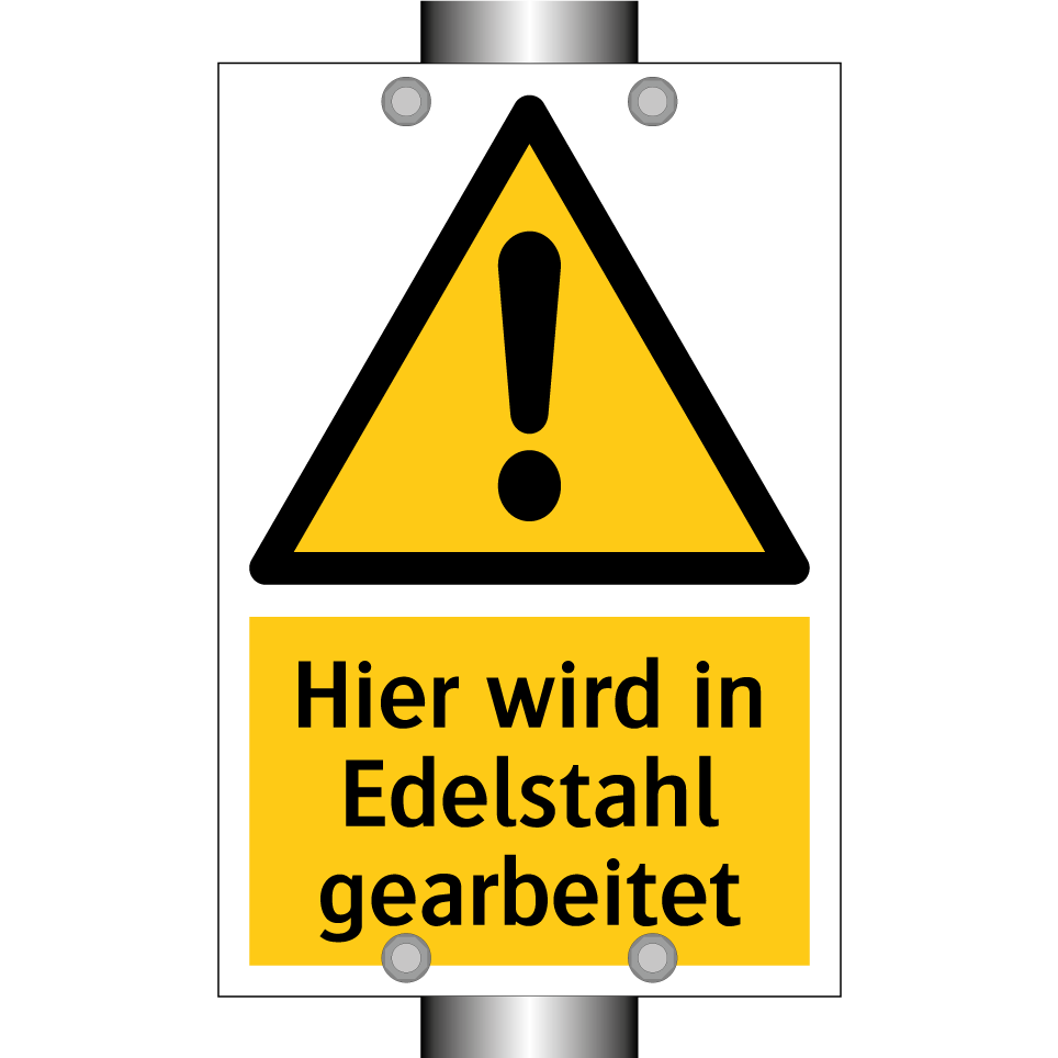 Warnschild mit dem Text Hier wird in Edelstahl gearbeitet