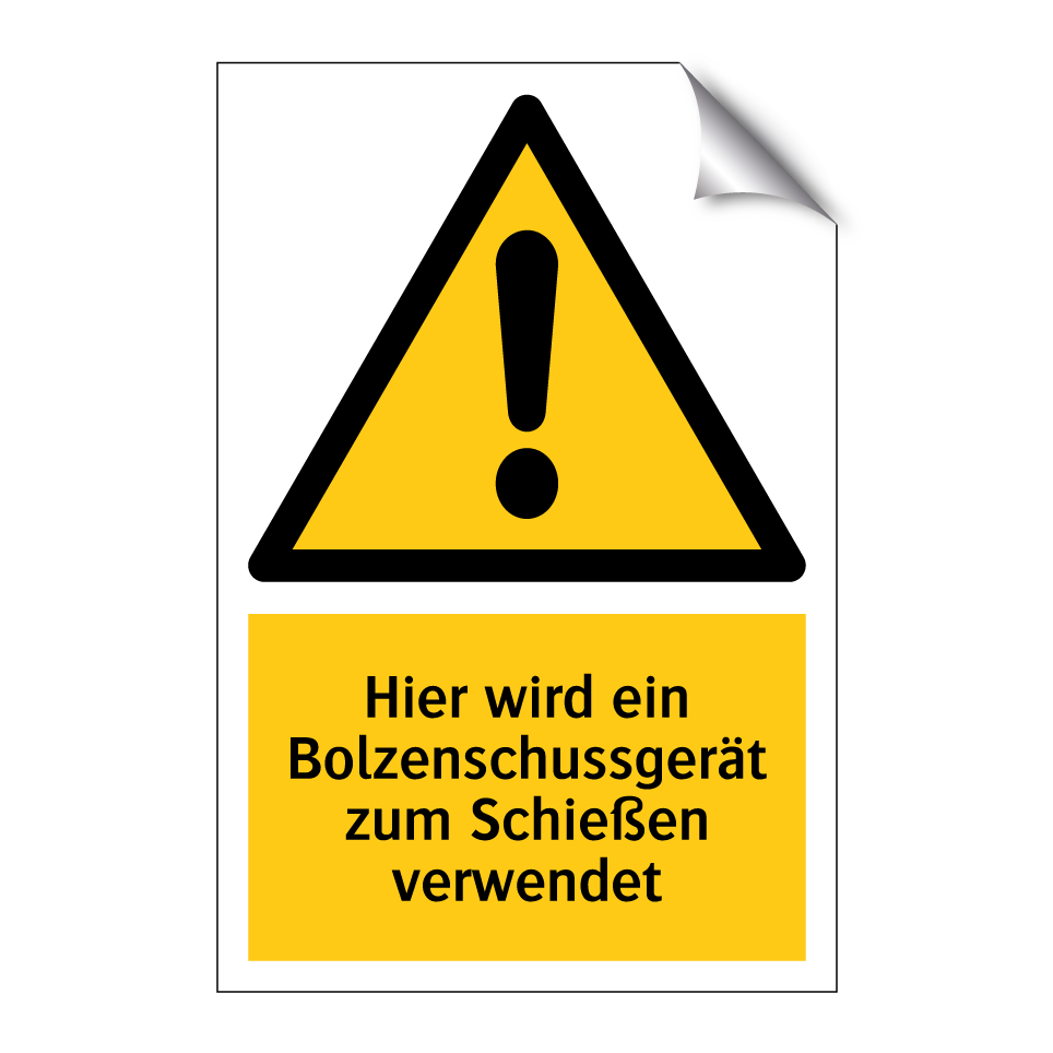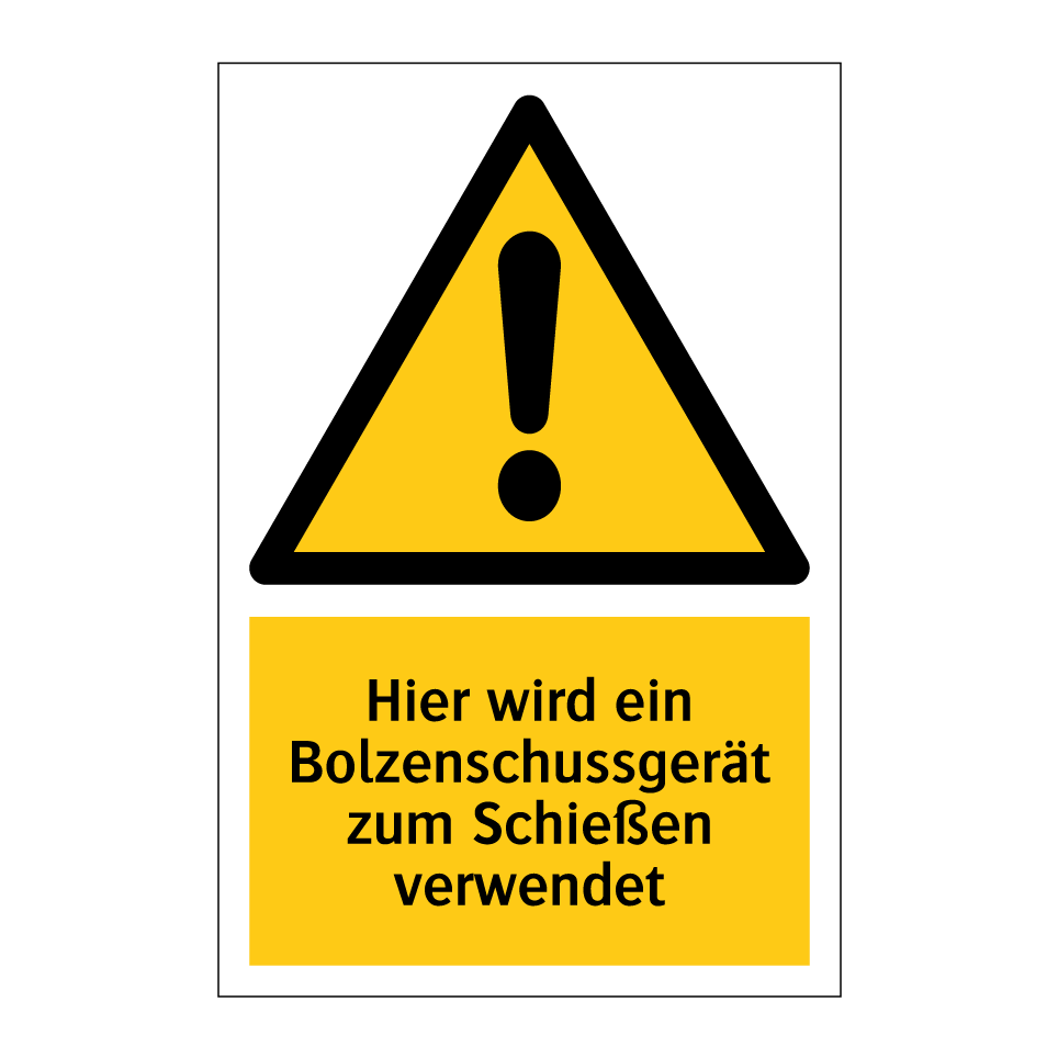 Warnschild mit dem Text Hier wird ein Bolzenschussgerät zum Schießen verwendet