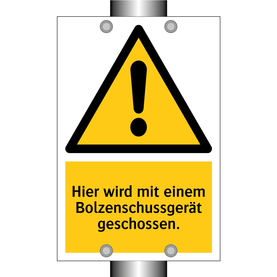 Warnschild mit dem Text Hier wird mit einem Bolzenschussgerät geschossen.