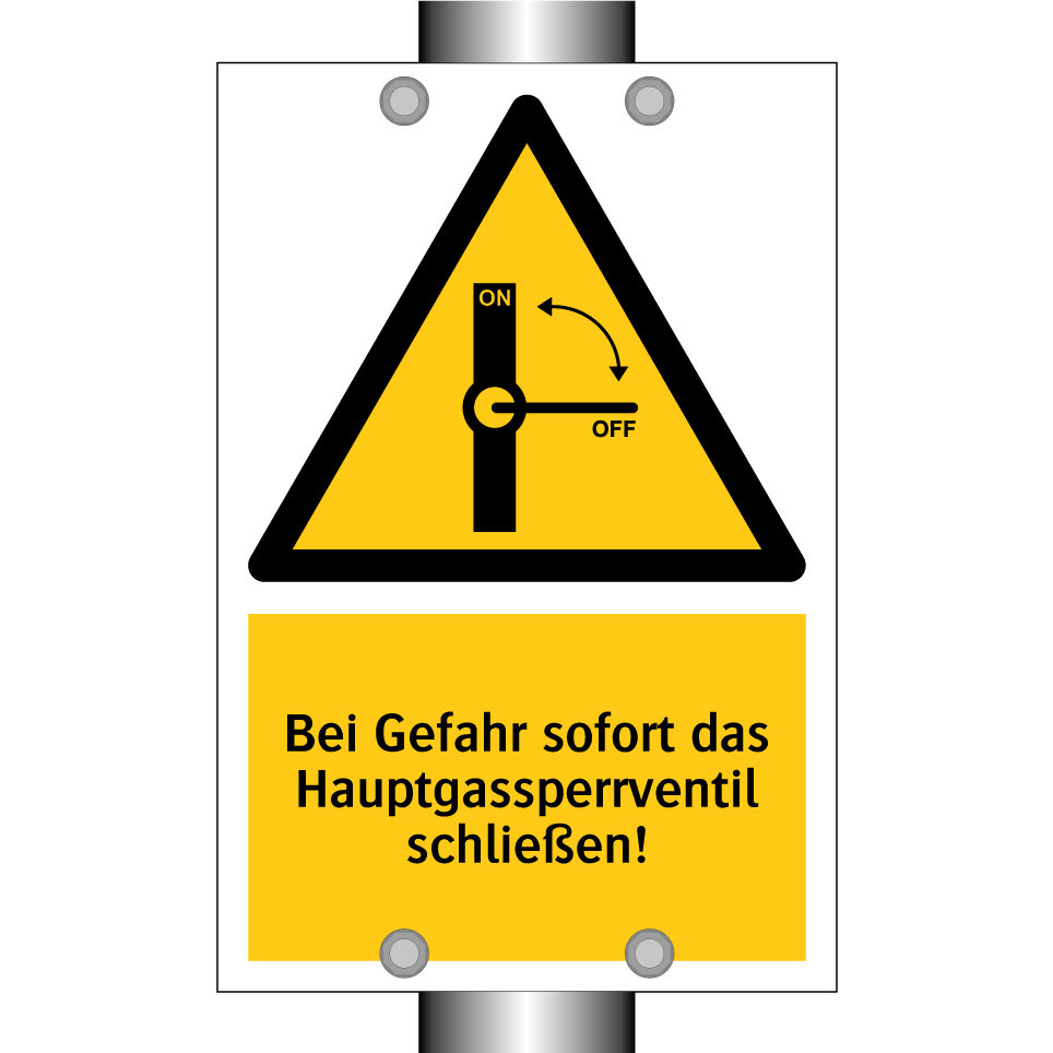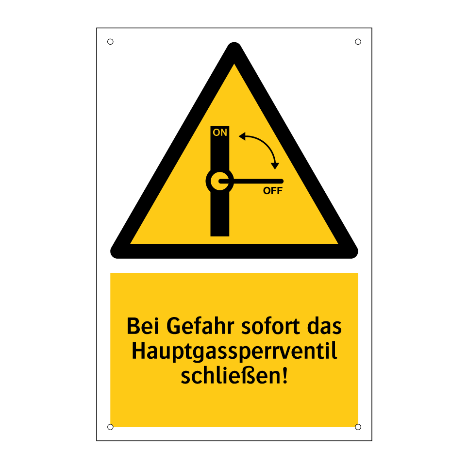 Warnschild mit dem Text Bei Gefahr sofort das Hauptgassperrventil schließen!