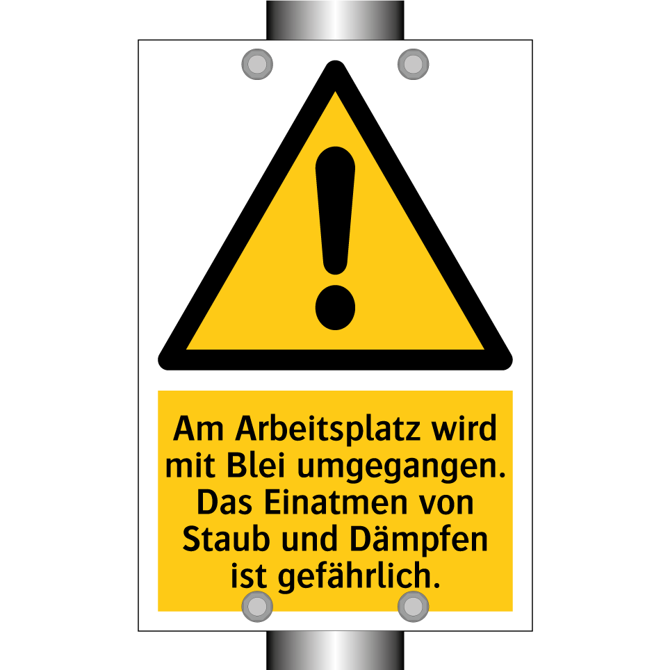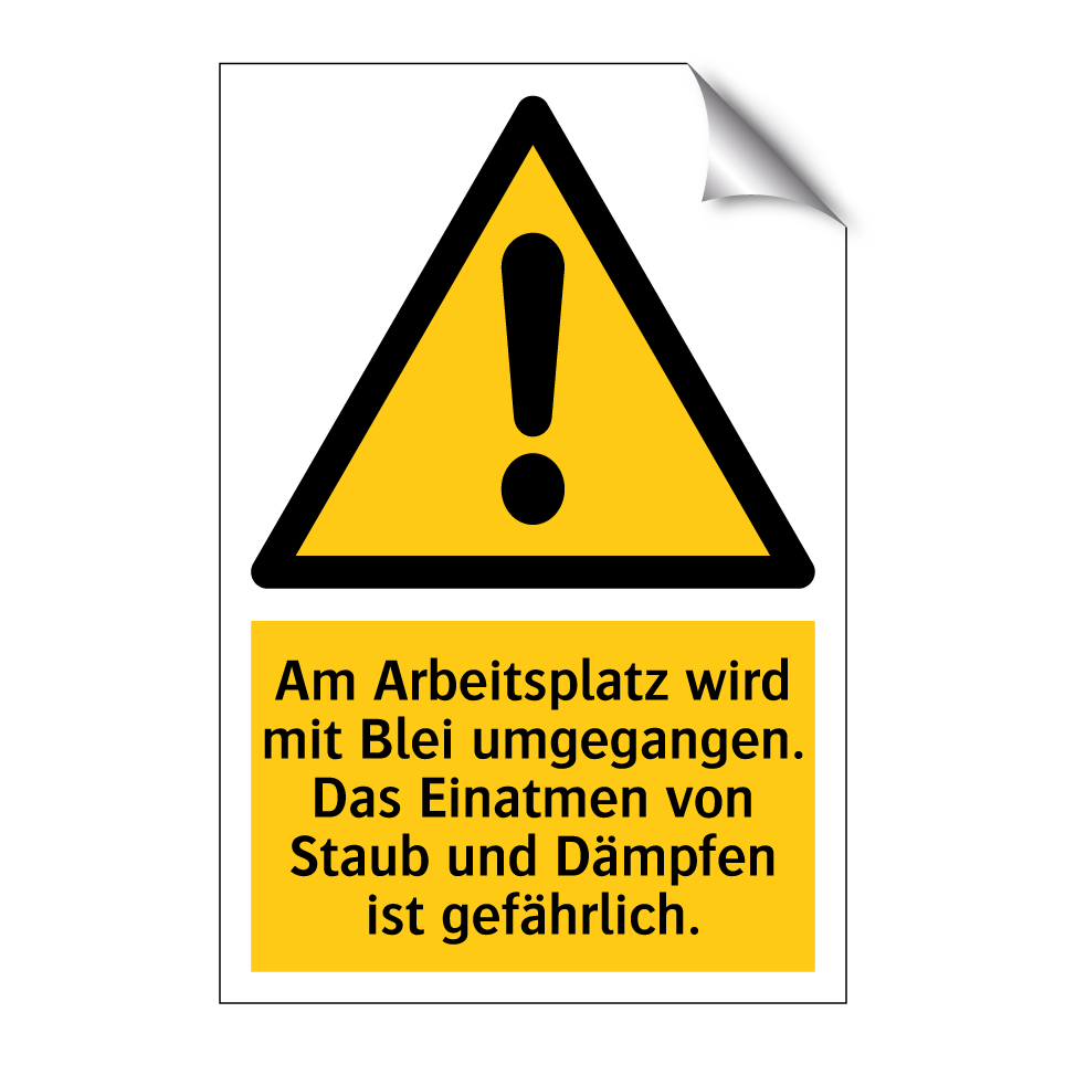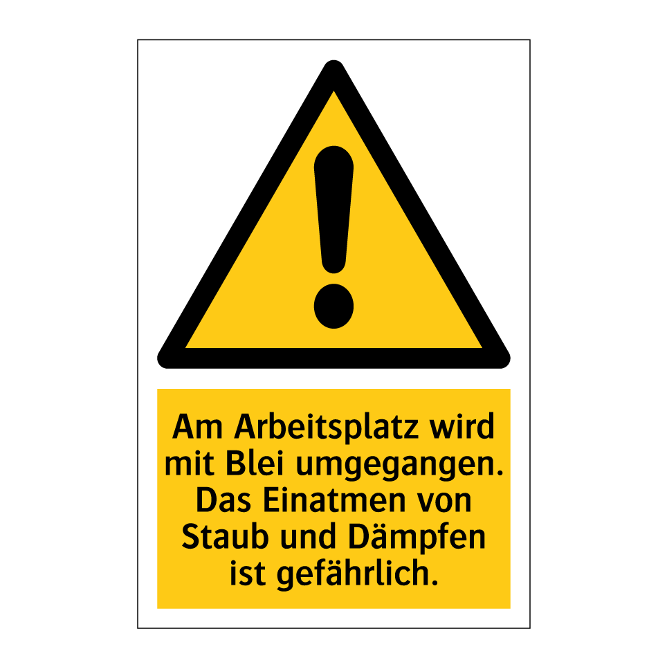Warnschild mit dem Text Am Arbeitsplatz wird mit Blei umgegangen. Das Einatmen von Staub und Dämpfen ist gefährlich.