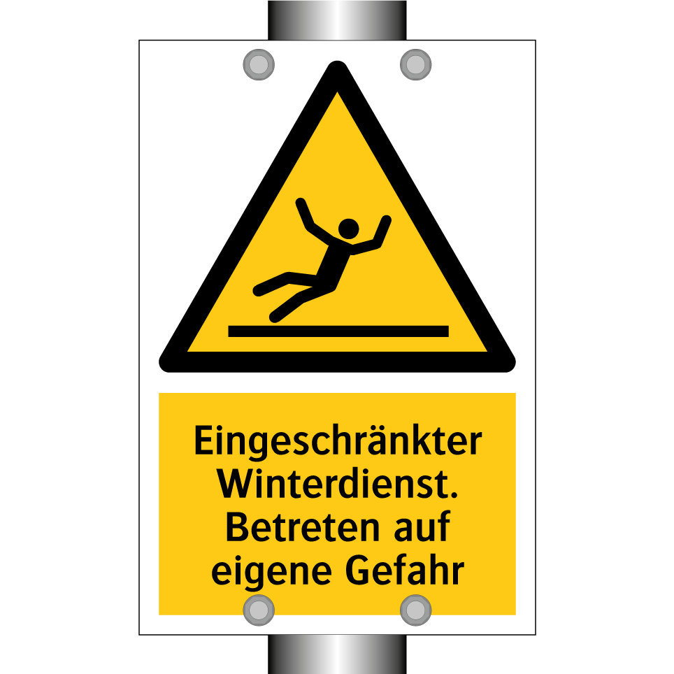 Diese Warnschild ist ideal für Bereiche, in denen der Winterdienst eingeschränkt ist. Es erinnert Fußgänger daran, dass sie auf eigene Gefahr betreten. Die auffällige gelbe Hintergrundfarbe und die schwarze Schrift mit Symbol machen es leicht erkennbar, selbst bei schlechten Lichtverhältnissen. Platzieren Sie das Warnschild an Eingängen, Gehwegen oder Parkplätzen, um die Sicherheit zu erhöhen und Unfälle zu vermeiden. Es eignet sich besonders für öffentliche Plätze, Wohnanlagen oder Firmengelände, wo die Winterwartung nicht regelmäßig durchgeführt wird. Mit diesem Warnschild sorgen Sie für mehr Bewusstsein und Vorsicht in gefährdeten Bereichen.
