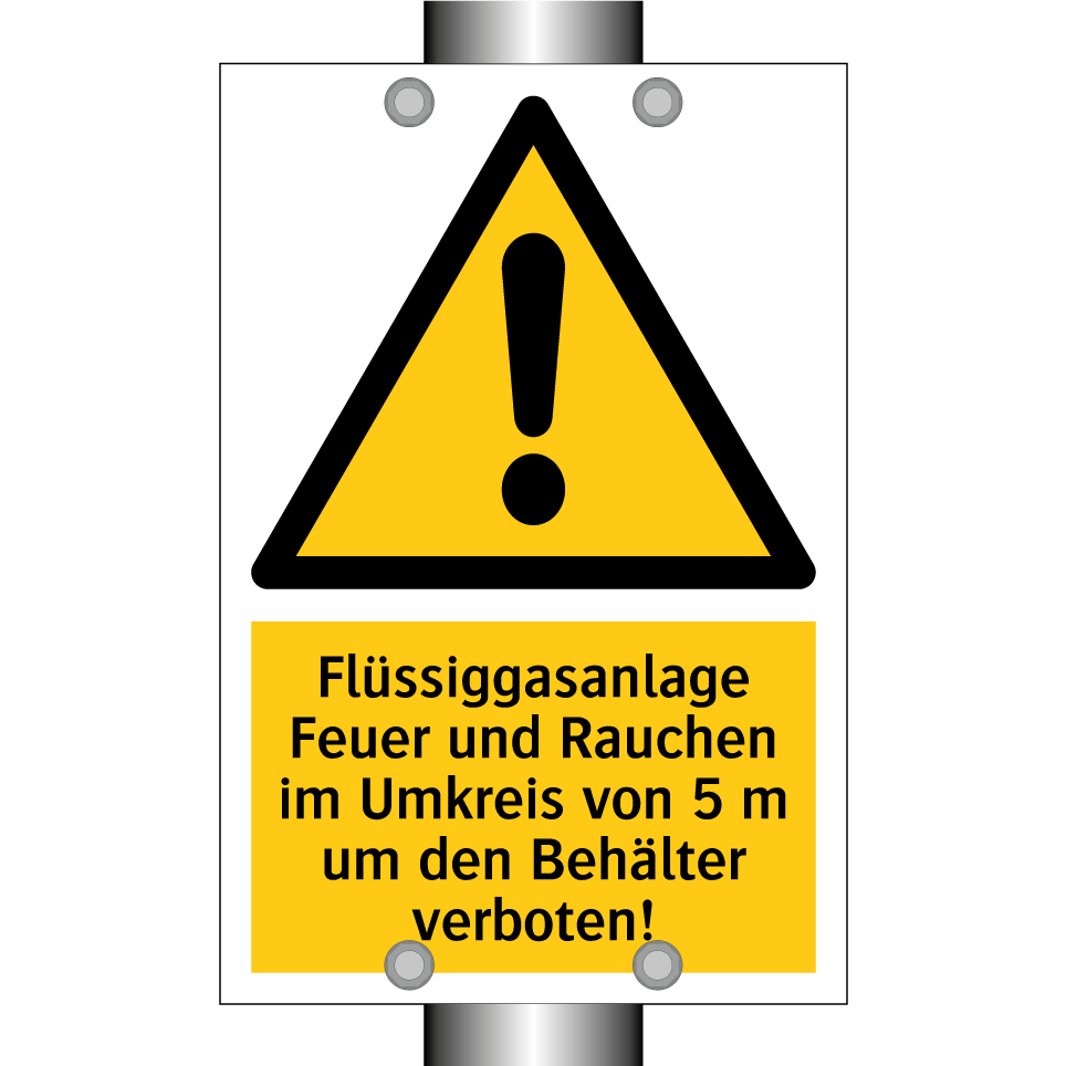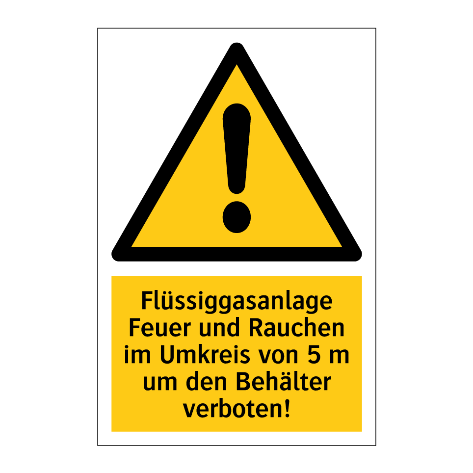 Warnschild mit dem Text Flüssiggasanlage Feuer und Rauchen im Umkreis von 5 m um den Behälter verboten!