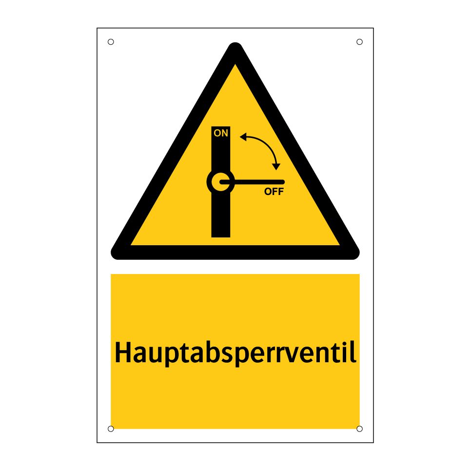 Diese auffällige Warnschild mit gelbem Hintergrund und schwarzer Schrift ist ideal für den Einsatz in Bereichen, in denen das Hauptabsperrventil schnell gefunden werden muss. Es dient dazu, die Sicherheit zu erhöhen, indem es auf die Position des Hauptabsperrventils hinweist. Diese Warnschilder sind besonders nützlich in industriellen Umgebungen, Fabriken oder großen Gebäudekomplexen, wo eine schnelle Reaktion im Notfall entscheidend ist. Platzieren Sie das Schild in der Nähe von Maschinenräumen, Heizungsanlagen oder anderen technischen Einrichtungen, um sicherzustellen, dass es leicht sichtbar ist. Die klare Symbolik und die deutliche Beschriftung machen es einfach, die Funktion des Ventils sofort zu erkennen.
