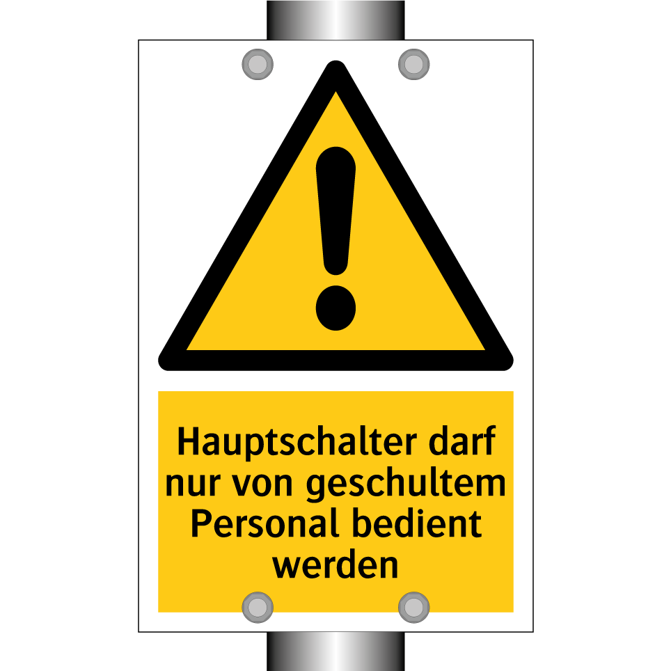 Warnschild mit dem Text Hauptschalter darf nur von geschultem Personal bedient werden