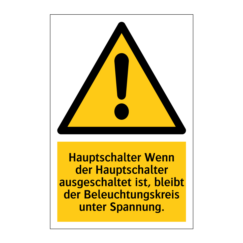 Warnschild mit dem Text Hauptschalter Wenn der Hauptschalter ausgeschaltet ist, bleibt der Beleuchtungskreis unter Spannung.