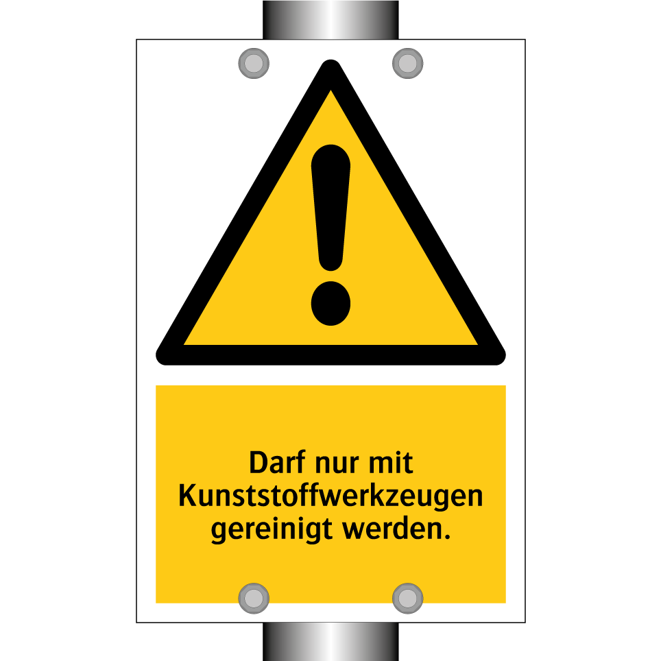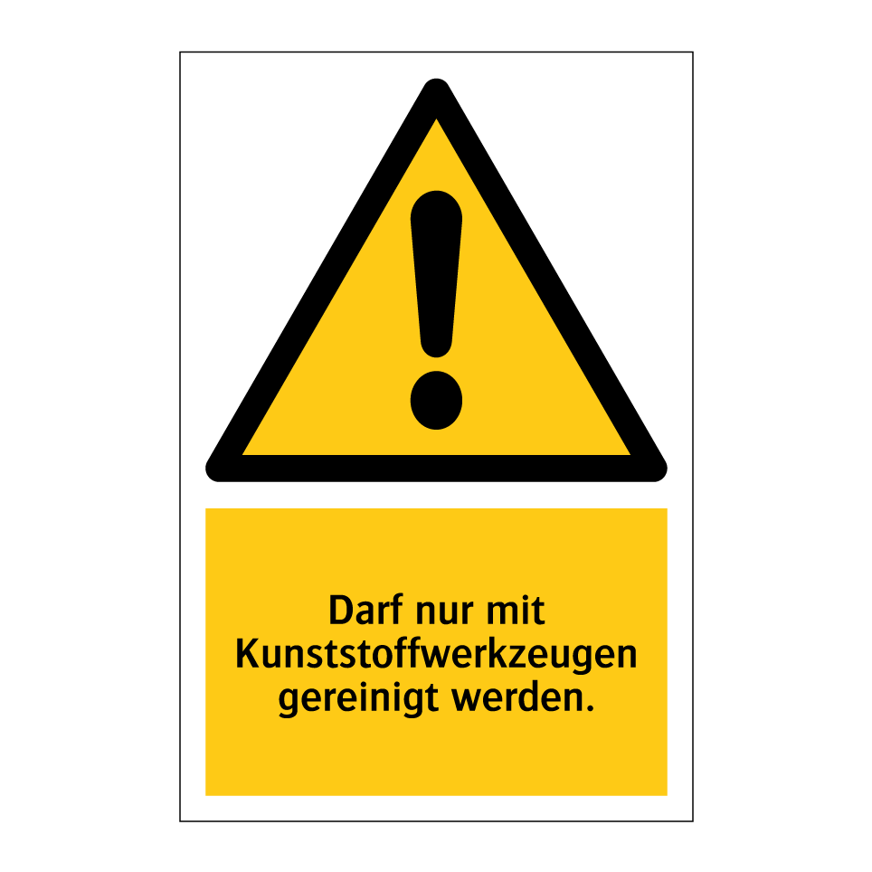 Warnschild mit dem Text Darf nur mit Kunststoffwerkzeugen gereinigt werden.