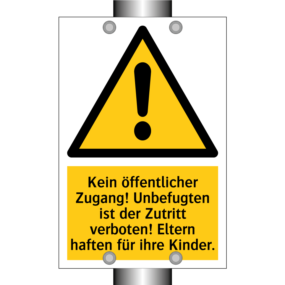 Warnschild mit dem Text Kein öffentlicher Zugang! Unbefugten ist der Zutritt verboten! Eltern haften für ihre Kinder.